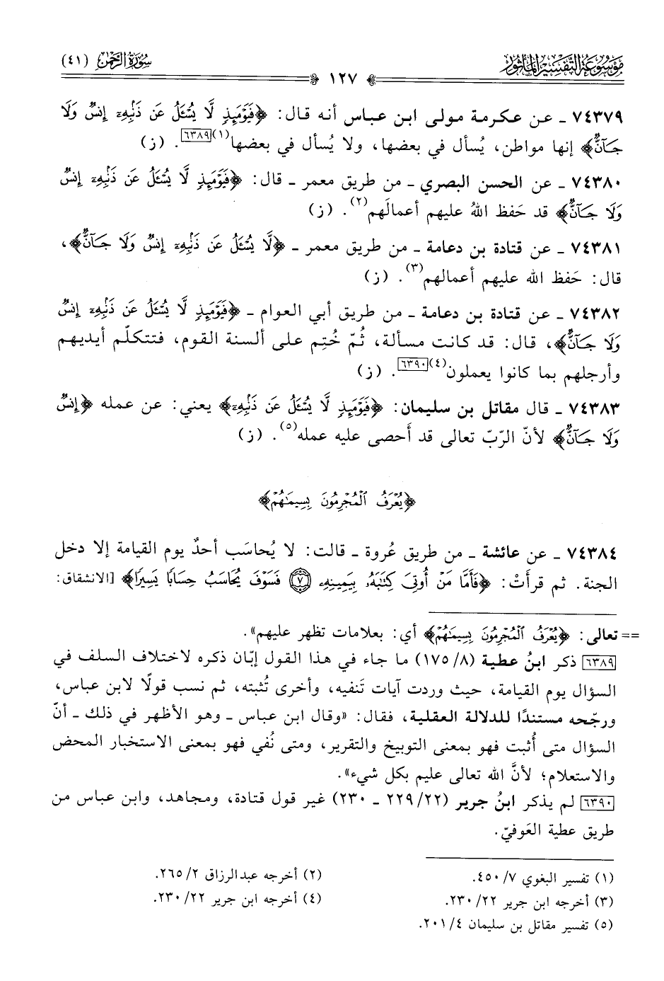٧٤٣٧٩ - عن عكرمة مولى ابن عباس أنه قال: {فَيَوْمَئِذٍ لا يُسْأَلُ عَنْ ذَنْبِهِ إنْسٌ ولا جانٌّ} إنها مواطن، يُسأل في بعضها، ولا يُسأل في بعضها (¬١) [٦٣٨٩]. (ز)