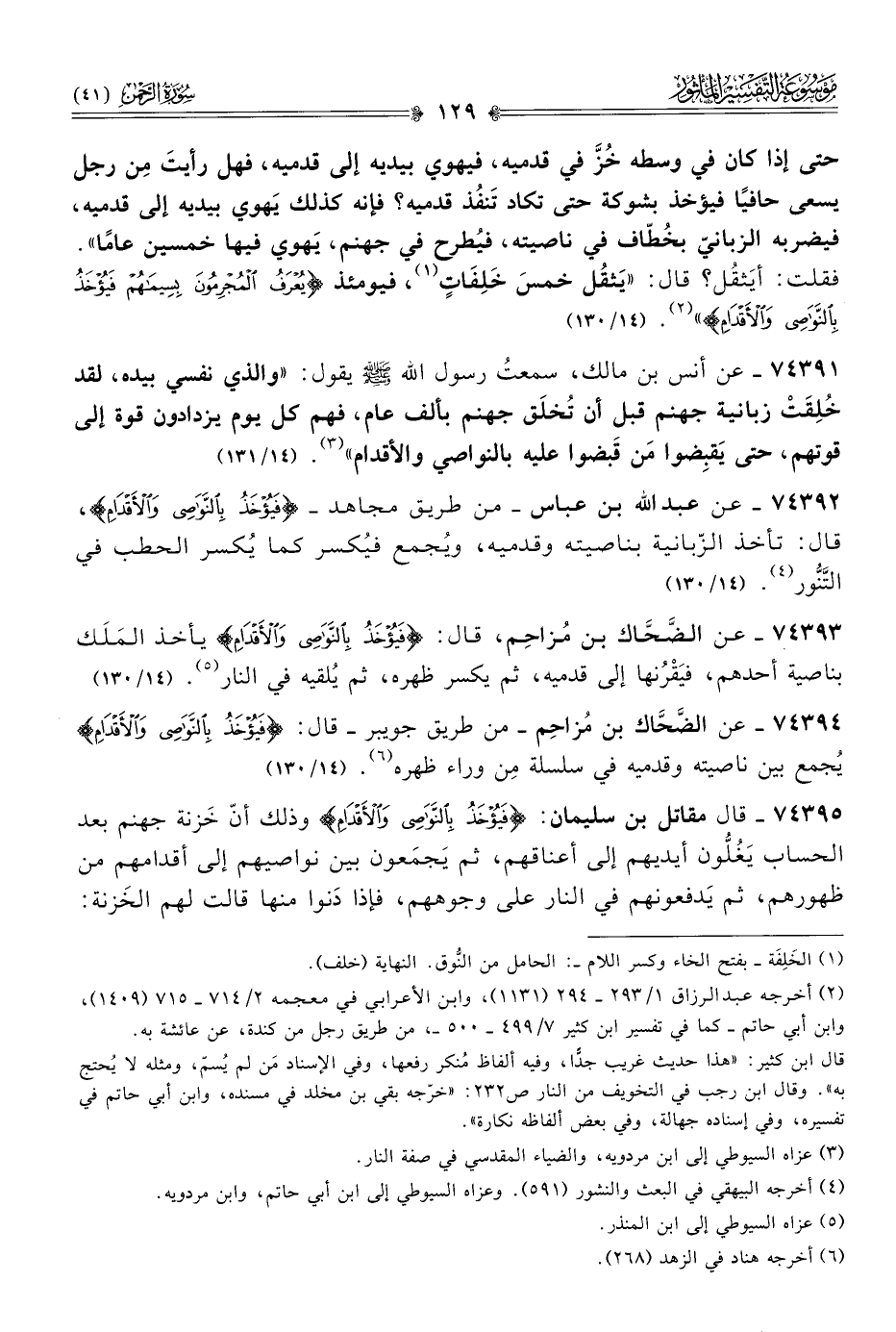 ٧٤٣٩٣ - عن الضَّحّاك بن مُزاحِم، قال: {فَيُؤْخَذُ بِالنَّواصِي والأَقْدامِ} يأخذ المَلَك بناصية أحدهم، فيَقْرُنها إلى قدميه، ثم يكسر ظهره، ثم يُلقيه في النار (¬٥). (١٤/ ١٣٠)