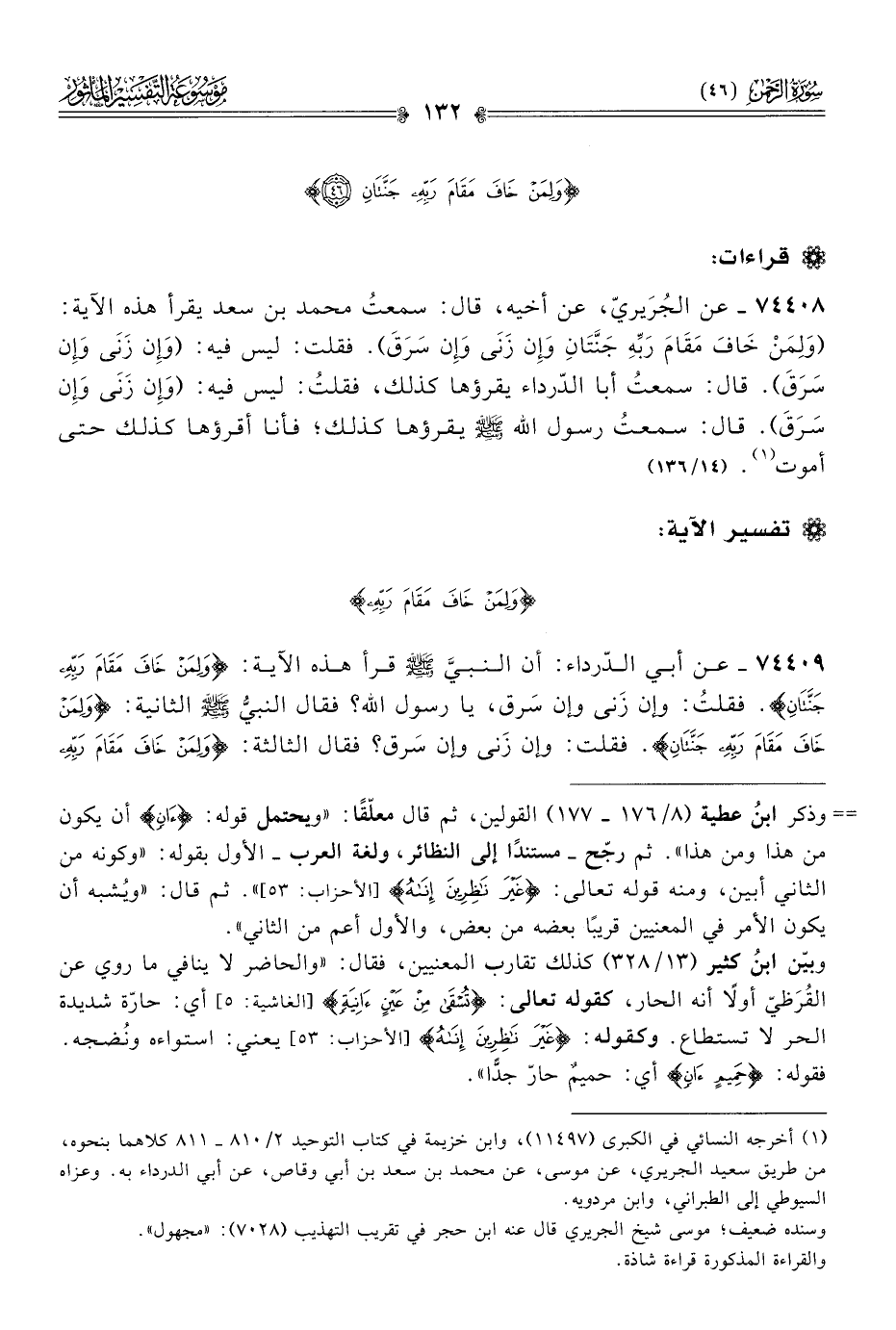 ٧٤٤٠٨ - عن الجُرَيريّ، عن أخيه، قال: سمعتُ محمد بن سعد يقرأ هذه الآية: (ولِمَن خافَ مَقامَ رَبِّهِ جَنَّتانِ وإن زَنى وإن سَرَقَ). فقلت: ليس فيه: (وإن زَنى وإن سَرَقَ). قال: سمعتُ أبا الدّرداء يقرؤها كذلك، فقلتُ: ليس فيه: (وإن زَنى وإن سَرَقَ). قال: سمعتُ رسول الله - صلى الله عليه وسلم - يقرؤها كذلك؛ فأنا أقرؤها كذلك حتى أموت (¬١). (١٤/ ١٣٦)
