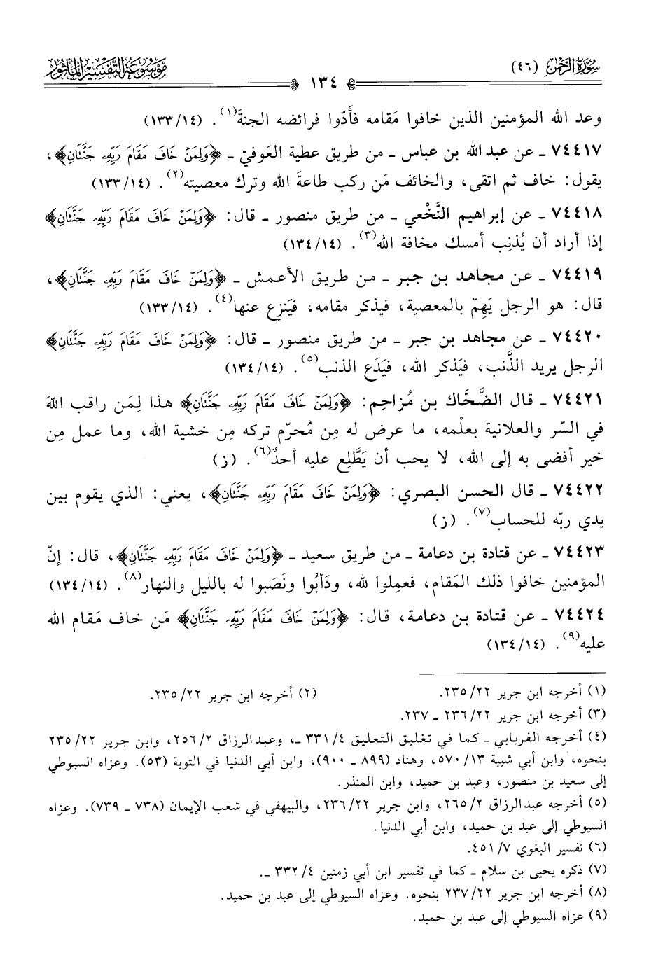 ٧٤٤٢٢ - قال الحسن البصري: {ولِمَن خافَ مَقامَ رَبِّهِ جَنَّتانِ}، يعني: الذي يقوم بين يدي ربّه للحساب (¬٧). (ز)