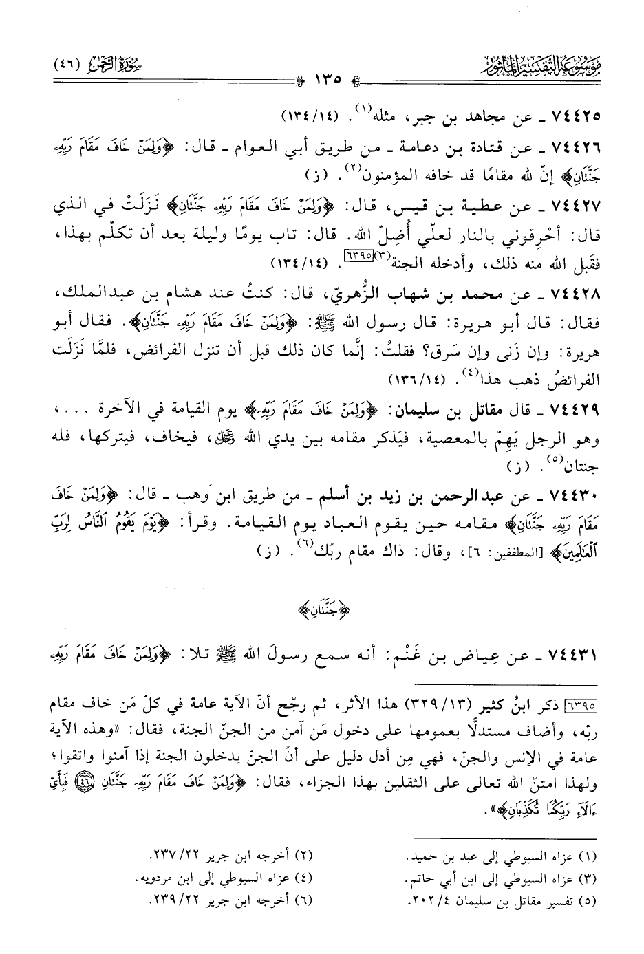 ٧٤٤٢٧ - عن عطية بن قيس، قال: {ولِمَن خافَ مَقامَ رَبِّهِ جَنَّتانِ} نَزَلَتْ في الذي قال: أحْرِقوني بالنار لعلّي أُضِلّ الله. قال: تاب يومًا وليلة بعد أن تكلّم بهذا، فقَبل الله منه ذلك، وأدخله الجنة (¬٣) [٦٣٩٥]. (١٤/ ١٣٤)