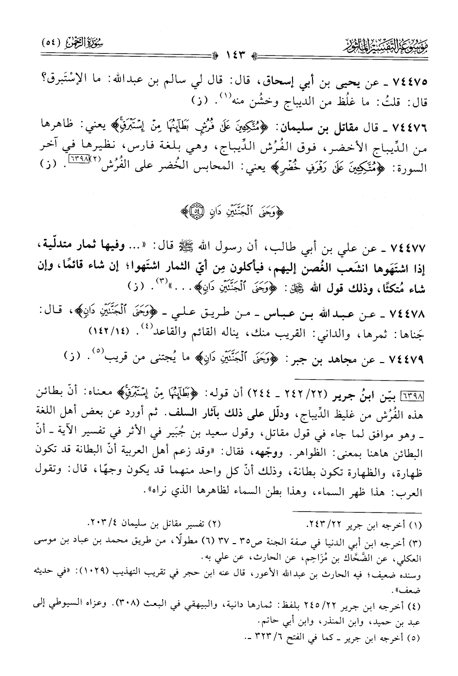 ٧٤٤٧٨ - عن عبد الله بن عباس -من طريق علي- {وجَنى الجَنَّتَيْنِ دانٍ}، قال: جَناها: ثمرها، والداني: القريب منك، يناله القائم والقاعد (¬٤). (١٤/ ١٤٢)