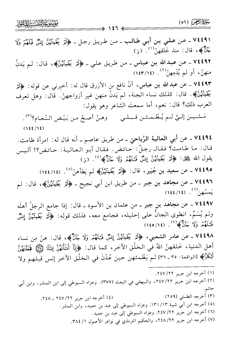 ٧٤٤٩٨ - عن عامر الشعبي، {لَمْ يَطْمِثْهُنَّ إنْسٌ قَبْلَهُمْ ولا جانٌّ}، قال: هنّ مِن نساء أهل الدنيا، خَلقهنّ اللهُ في الخلْق الآخر، كما قال: {إنّا أنْشَأْناهُنَّ إنْشاءً * فَجَعَلْناهُنَّ أبْكارًا} [الواقعة: ٣٥ - ٣٦] لم يَطْمثهن حين عُدْنَ في الخلْق الآخر إنس قبلهم ولا