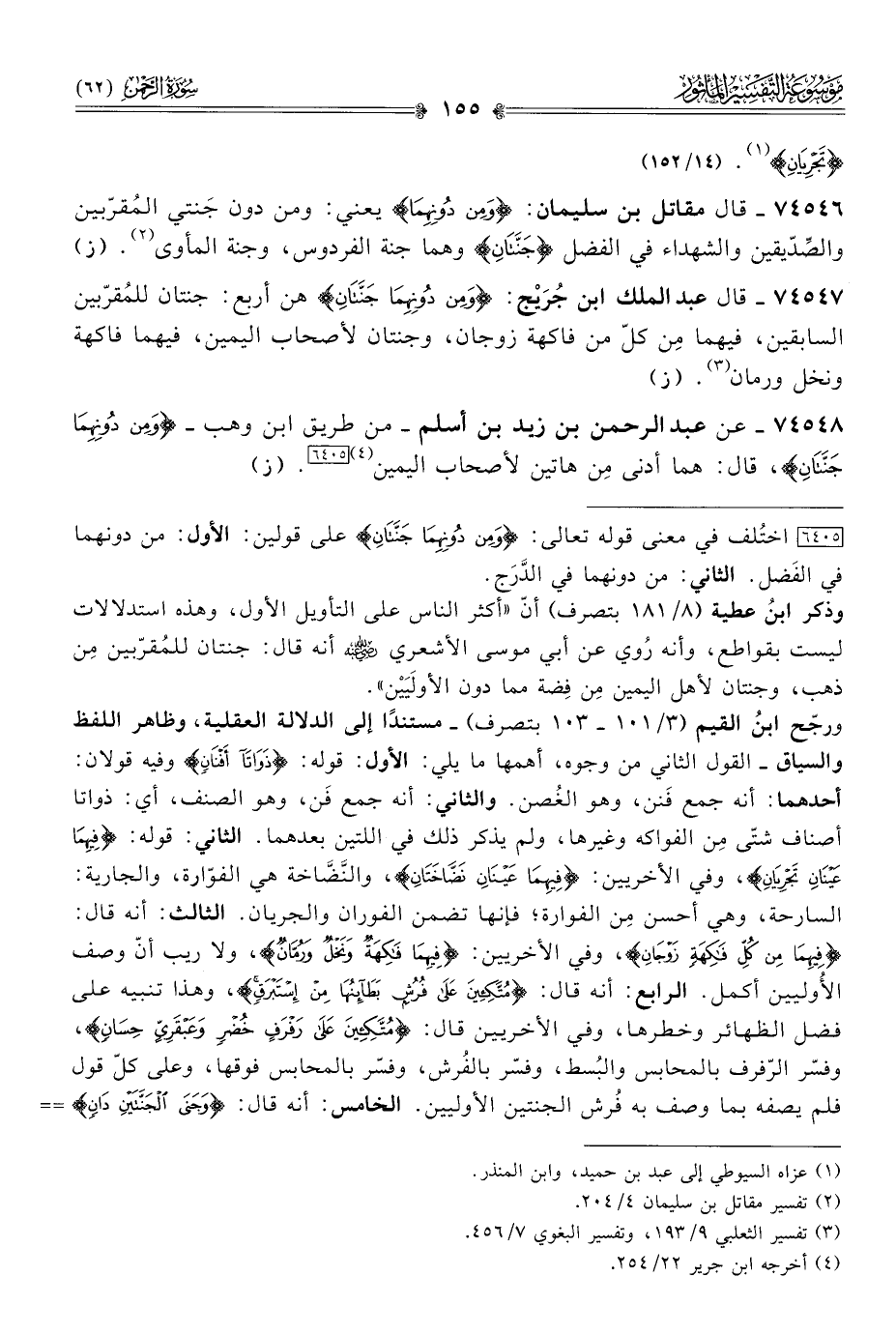 ٧٤٥٤٧ - قال عبد الملك ابن جُرَيْج: {ومِن دُونِهِما جَنَّتانِ} هن أربع: جنتان للمُقرّبين السابقين، فيهما مِن كلّ من فاكهة زوجان، وجنتان لأصحاب اليمين، فيهما فاكهة ونخل ورمان (¬٣). (ز)