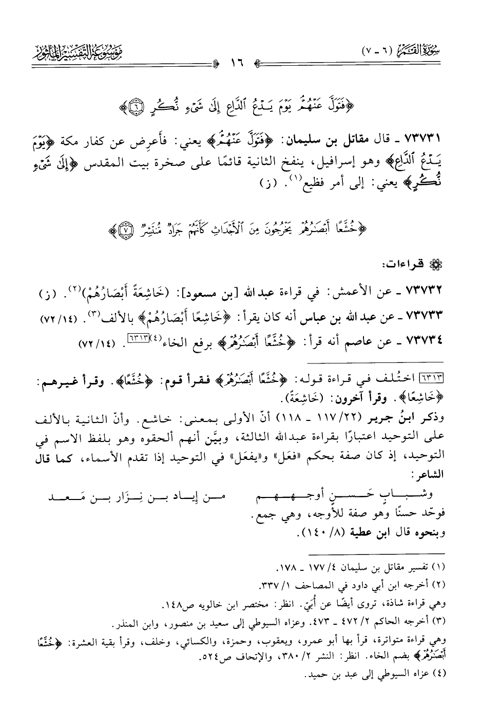 ٧٣٧٣٢ - عن الأعمش: في قراءة عبد الله [بن مسعود]: (خاشِعَةً أبْصارُهُمْ) (¬٢). (ز)