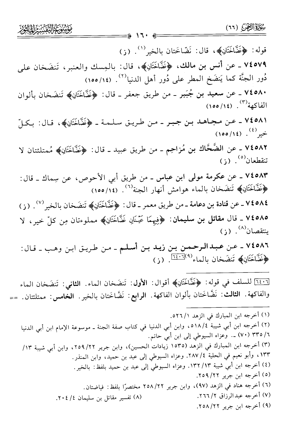 ٧٤٥٨٠ - عن سعيد بن جُبَير -من طريق جعفر- قال: {نَضّاخَتانِ} تَنضَخان بألوان الفاكهة (¬٣). (١٤/ ١٥٥) ٧٤٥٨١ - عن مجاهد بن جبر -من طريق سلمة- {نَضّاخَتانِ}، قال: بكلّ خير (¬٤). (١٤/ ١٥٥)