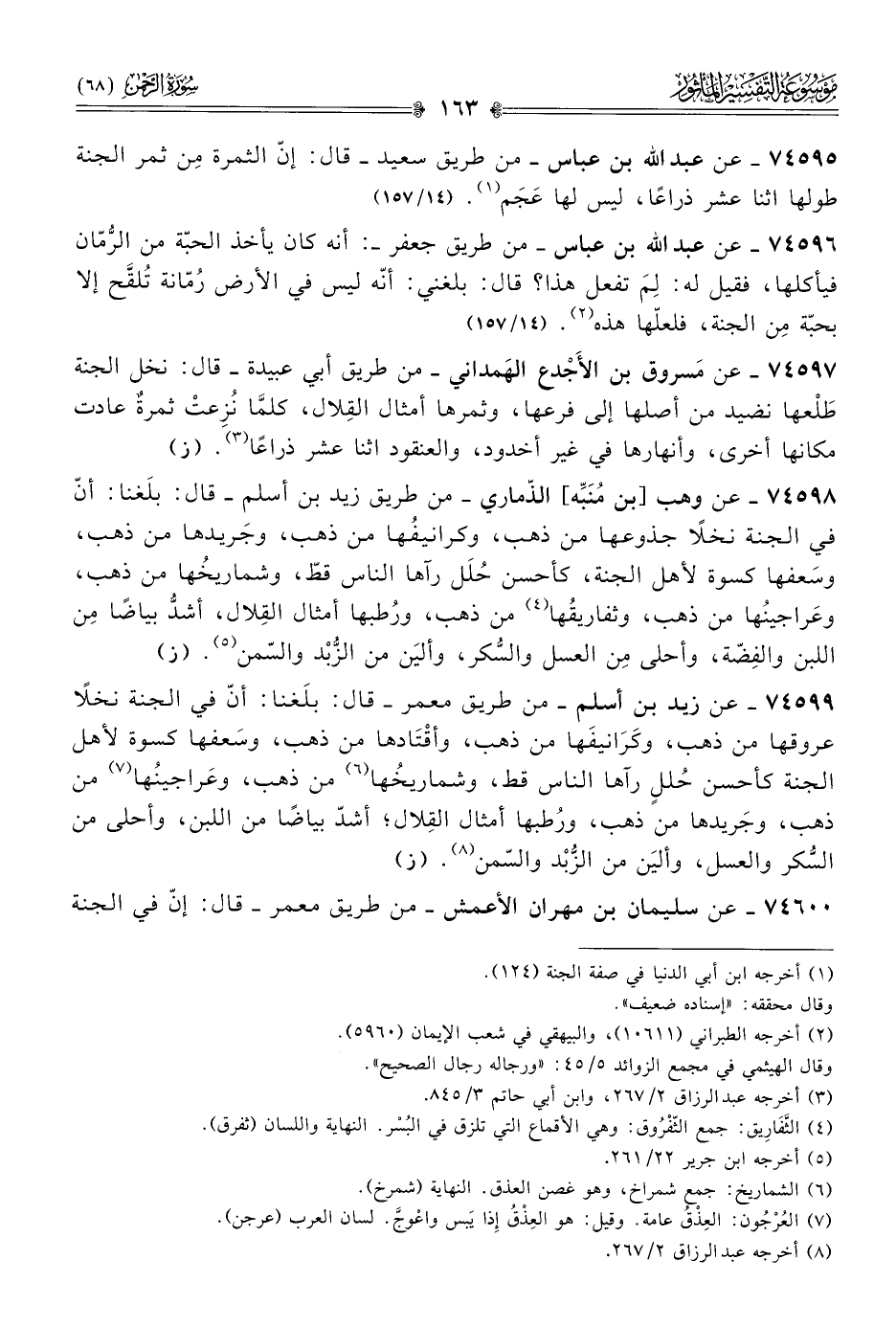 ٧٤٥٩٧ - عن مَسروق بن الأَجْدع الهَمداني -من طريق أبي عبيدة- قال: نخل الجنة طَلْعها نضيد من أصلها إلى فرعها، وثمرها أمثال القِلال، كلمّا نُزِعتْ ثمرةٌ عادت مكانها أخرى، وأنهارها في غير أخدود، والعنقود اثنا عشر ذراعًا (¬٣). (ز)