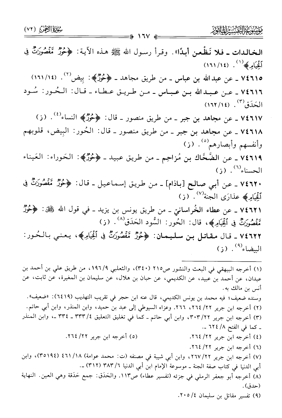 ٧٤٦١٨ - عن مجاهد بن جبر -من طريق منصور- قال: الحُور: البِيض، قلوبهم وأنفسهم وأبصارهم (¬٥). (ز)