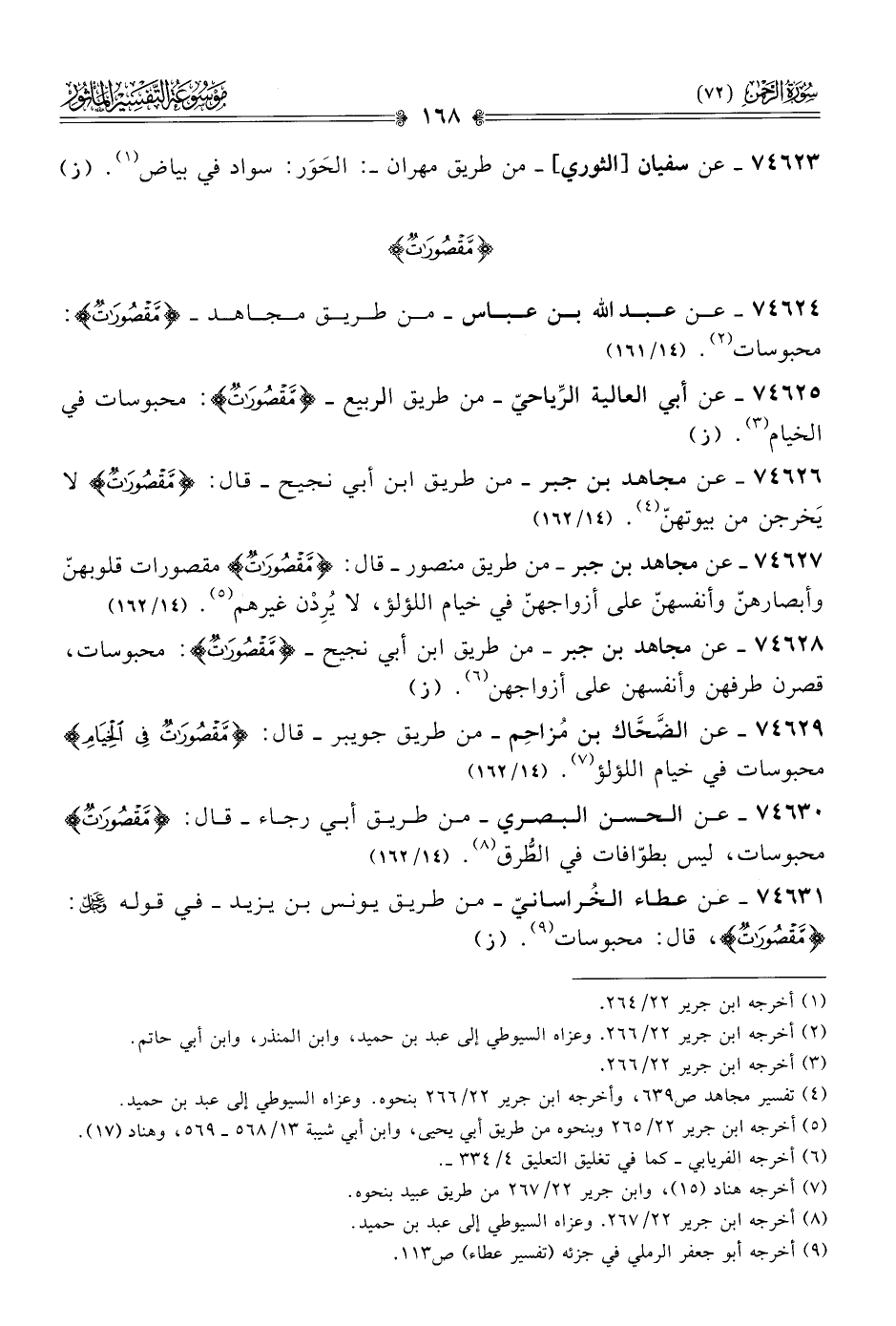 ٧٤٦٢٦ - عن مجاهد بن جبر -من طريق ابن أبي نجيح- قال: {مَقْصُوراتٌ} لا يَخرجن من بيوتهنّ (¬٤). (١٤/ ١٦٢)