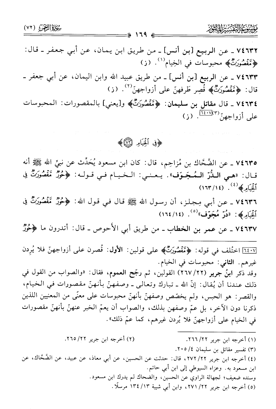 ٧٤٦٣٥ - عن الضَّحّاك بن مُزاحِم، قال: كان ابن مسعود يُحَدِّث عن نبيِّ الله - صلى الله عليه وسلم - أنه قال: «هي الدُّرّ المُجَوّف». يعني: الخيام في قوله: {حُورٌ مَقْصُوراتٌ فِي الخِيامِ} (¬٤). (١٤/ ١٦٣)