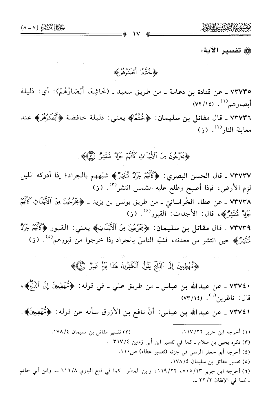 ٧٣٧٣٥ - عن قتادة بن دعامة -من طريق سعيد- (خاشِعًا أبْصارُهُمْ): أي: ذليلة أبصارهم (¬١). (١٤/ ٧٢)
