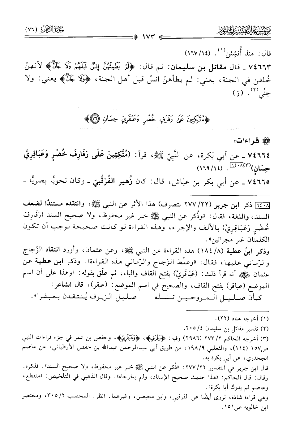 [٦٤٠٨] ذكر ابن جرير (٢٢/ ٢٧٧ بتصرف) هذا الأثر عن النبي - صلى الله عليه وسلم -، وانتقده مستندًا لضعف السند، واللغة، فقال: «وذُكر عن النبي - صلى الله عليه وسلم - خبر غير محفوظ، ولا صحيح السند (رَفارِفَ خُضْرٍ وعَباقِرِيَّ) بالألف والإجراء، وهذه القراءة لو كانت صحيحة لوجب أن تكون الكلمتان غير مجراتين».