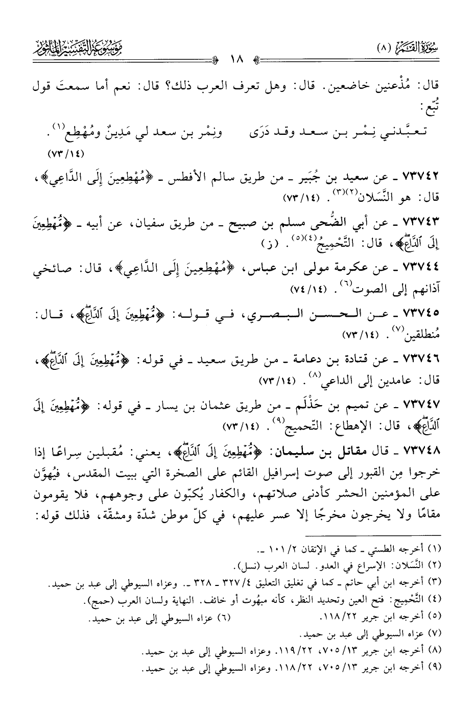 ٧٣٧٤٢ - عن سعيد بن جُبَير -من طريق سالم الأفطس- «مُهْطِعِينَ إلى الدّاعِي»، قال: هو النَّسَلان (¬٢) (¬٣). (١٤/ ٧٣)