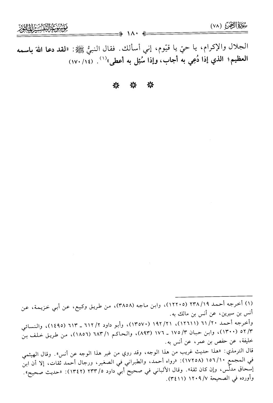 الجلال والإكرام، يا حيّ يا قيّوم، إني أسألك. فقال النبيُّ - صلى الله عليه وسلم -: «لقد دعا اللهَ باسمه العظيم؛ الذي إذا دُعِي به أجاب، وإذا سُئِل به أعطى» (¬١). (١٤/ ١٧٠)