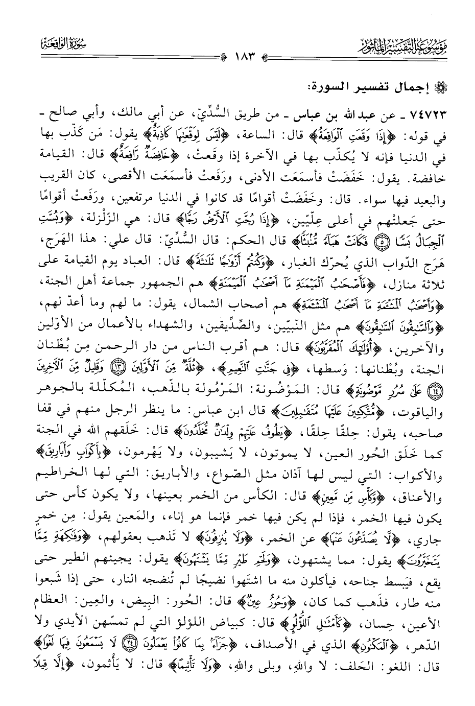 ٧٤٧٢٣ - عن عبد الله بن عباس -من طريق السُّدِّيّ، عن أبي مالك، وأبي صالح- في قوله: {إذا وقَعَتِ الواقِعَةُ} قال: الساعة، {لَيْسَ لِوَقْعَتِها كاذِبَةٌ} يقول: مَن كَذّب بها في الدنيا فإنه لا يُكذّب بها في الآخرة إذا وقَعتْ، {خافِضَةٌ رافِعَةٌ} قال: القيامة خافضة. يقول: خَفَضَتْ فأسمَعَت الأدنى، ورَفَعتْ فأسمَعَت الأقصى، كان القريب والبعيد فيها سواء. قال: وخَفَضَتْ أقوامًا قد كانوا في الدنيا مرتفعين، ورَفَعتْ أقوامًا حتى جَعلتْهم في أعلى عِلّيّين، {إذا رُجَّتِ الأَرْضُ رَجًّا} قال: هي الزّلْزلة، {وبُسَّتِ الجِبالُ بَسًّا فَكانَتْ هَباءً مُنْبَثًّا} قال الحكم: قال السُّدِّيّ: قال علي: هذا الهَرَج، هَرَج الدّواب الذي يُحرّك الغبار، {وكُنْتُمْ أزْواجًا ثَلاثَةً} قال: العباد يوم القيامة على ثلاثة منازل، {فَأَصْحابُ المَيْمَنَةِ ما أصْحابُ المَيْمَنَةِ} هم الجمهور جماعة أهل الجنة، {وأَصْحابُ المَشْأَمَةِ ما أصْحابُ المَشْأَمَةِ} هم أصحاب الشمال، يقول: ما لهم وما أعدّ لهم، {والسّابِقُونَ السّابِقُونَ} هم مثل النّبيّين، والصِّدِّيقين، والشهداء بالأعمال من الأوّلين والآخرين، {أُولَئِكَ المُقَرَّبُونَ} قال: هم أقرب الناس من دار الرحمن مِن بُطْنان الجنة، وبُطْنانها: وسطها، {فِي جَنّاتِ النَّعِيمِ}، {ثُلَّةٌ مِنَ الأَوَّلِينَ وقَلِيلٌ مِنَ الآخِرِينَ عَلى سُرُرٍ مَوْضُونَةٍ} قال: المَوْضُونة: المَرْمُولة بالذّهب، المُكلّلة بالجوهر والياقوت، {مُتَّكِئِينَ عَلَيْها مُتَقابِلِينَ} قال ابن عباس: ما ينظر الرجل منهم في قفا صاحبه، يقول: حِلقًا حِلقًا، {يَطُوفُ عَلَيْهِمْ وِلْدانٌ مُخَلَّدُونَ} قال: خَلَقهم الله في الجنة كما خَلَق الحُور العين، لا يموتون، لا يَشيبون، ولا يَهْرمون، {بِأَكْوابٍ وأَبارِيقَ} والأكواب: التي ليس لها آذان مثل الصّواع، والأباريق: التي لها الخراطيم والأعناق، {وكَأْسٍ مِن مَعِينٍ} قال: الكأس من الخمر بعينها، ولا يكون كأس حتى يكون فيها الخمر، فإذا لم يكن فيها خمر فإنما هو إناء، والمَعين يقول: مِن خمرٍ جاري، {لا يُصَدَّعُونَ عَنْها} عن الخمر، {ولا يُنْزِفُونَ} لا تَذهب بعقولهم، {وفاكِهَةٍ مِمّا يَتَخَيَّرُونَ} يقول: مما يشتهون، {ولَحْمِ طَيْرٍ مِمّا يَشْتَهُونَ} يقول: يجيئهم الطير حتى يقع، فيَبسط جناحه، فيأكلون منه ما اشتَهوا نضيجًا لم تُنضجه النار، حتى إذا شَبعوا منه طار، فذَهب كما كان، {وحُورٌ عِينٌ} قال: الحُور: البِيض، والعِين: العظام الأعين، حِسان، {كَأَمْثالِ اللُّؤْلُؤِ} قال: كبياض اللؤلؤ التي لم تمسّهن الأيدي ولا الدّهر، {المَكْنُونِ} الذي في الأصداف، {جَزاءً بِما كانُوا يَعْمَلُونَ لا يَسْمَعُونَ فِيها لَغْوًا} قال: اللغو: الحَلف: لا واللهِ، وبلى واللهِ، {ولا تَأْثِيمًا} قال: لا يَأْثمون، {إلّا قِيلًا