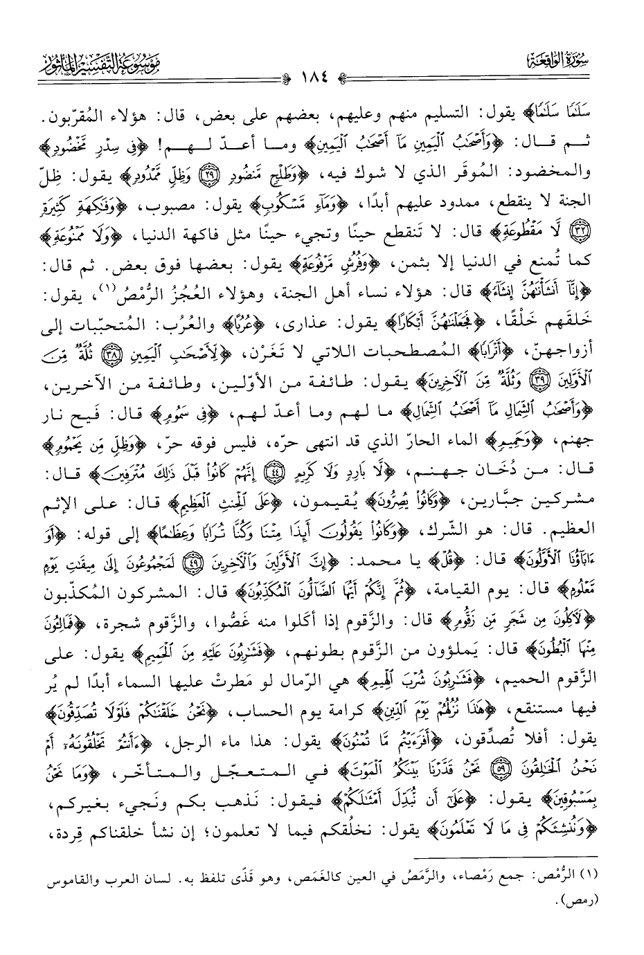 سَلامًا سَلامًا} يقول: التسليم منهم وعليهم، بعضهم على بعض، قال: هؤلاء المُقرّبون. ثم قال: {وأَصْحابُ اليَمِينِ ما أصْحابُ اليَمِينِ} وما أعدّ لهم! {فِي سِدْرٍ مَخْضُودٍ} والمخضود: المُوقَر الذي لا شوك فيه، {وطَلْحٍ مَنضُودٍ وظِلٍّ مَمْدُودٍ} يقول: ظِلّ الجنة لا ينقطع، ممدود عليهم أبدًا، {وماءٍ مَسْكُوبٍ} يقول: مصبوب، {وفاكِهَةٍ كَثِيرَةٍ لا مَقْطُوعَةٍ} قال: لا تَنقطع حينًا وتجيء حينًا مثل فاكهة الدنيا، {ولا مَمْنُوعَةٍ} كما تُمنع في الدنيا إلا بثمن، {وفُرُشٍ مَرْفُوعَةٍ} يقول: بعضها فوق بعض. ثم قال: {إنّا أنْشَأْناهُنَّ إنْشاءً} قال: هؤلاء نساء أهل الجنة، وهؤلاء العُجُزُ الرُّمْصُ (¬١)، يقول: خَلقَهم خَلْقًا، {فَجَعَلْناهُنَّ أبْكارًا} يقول: عذارى، {عُرُبًا} والعُرُب: المُتحبّبات إلى أزواجهنّ، {أتْرابًا} المُصطحبات اللاتي لا تَغَرْن، {لِأَصْحابِ اليَمِينِ ثُلَّةٌ مِنَ الأَوَّلِينَ وثُلَّةٌ مِنَ الآخِرِينَ} يقول: طائفة من الأوّلين، وطائفة من الآخرين، {وأَصْحابُ الشِّمالِ ما أصْحابُ الشِّمالِ} ما لهم وما أعدّ لهم، {فِي سَمُومٍ} قال: فَيح نار جهنم، {وحَمِيمٍ} الماء الحارّ الذي قد انتهى حرّه، فليس فوقه حرّ، {وظِلٍّ مِن يَحْمُومٍ} قال: من دُخان جهنم، {لا بارِدٍ ولا كَرِيمٍ إنَّهُمْ كانُوا قَبْلَ ذَلِكَ مُتْرَفِينَ} قال: مشركين جبّارين، {وكانُوا يُصِرُّونَ} يُقيمون، {عَلى الحِنْثِ العَظِيمِ} قال: على الإثم العظيم. قال: هو الشّرك، {وكانُوا يَقُولُونَ أئِذا مِتْنا وكُنّا تُرابًا وعِظامًا} إلى قوله: {أوَآباؤُنا الأَوَّلُونَ} قال: {قُلْ} يا محمد: {إنَّ الأَوَّلِينَ والآخِرِينَ لَمَجْمُوعُونَ إلى مِيقاتِ يَوْمٍ مَعْلُومٍ} قال: يوم القيامة، {ثُمَّ إنَّكُمْ أيُّها الضّالُّونَ المُكَذِّبُونَ} قال: المشركون المُكذّبون {لَآكِلُونَ مِن شَجَرٍ مِن زَقُّومٍ} قال: والزَّقوم إذا أكَلوا منه غَصُّوا، والزَّقوم شجرة، {فَمالِئُونَ مِنها البُطُونَ} قال: يَملؤون من الزَّقوم بطونهم، {فَشارِبُونَ عَلَيْهِ مِنَ الحَمِيمِ} يقول: على الزَّقوم الحميم، {فَشارِبُونَ شُرْبَ الهِيمِ} هي الرّمال لو مَطرتْ عليها السماء أبدًا لم يُر فيها مستنقع، {هَذا نُزُلُهُمْ يَوْمَ الدِّينِ} كرامة يوم الحساب، {نَحْنُ خَلَقْناكُمْ فَلَوْلا تُصَدِّقُونَ} يقول: أفلا تُصدِّقون، {أفَرَأَيْتُمْ ما تُمْنُونَ} يقول: هذا ماء الرجل، {أأَنْتُمْ تَخْلُقُونَهُ أمْ نَحْنُ الخالِقُونَ نَحْنُ قَدَّرْنا بَيْنَكُمُ المَوْتَ} في المتعجّل والمتأخّر، {وما نَحْنُ بِمَسْبُوقِينَ} يقول: {عَلى أنْ نُبَدِّلَ أمْثالَكُمْ} فيقول: نَذهب بكم ونَجيء بغيركم، {ونُنْشِئَكُمْ فِي ما لا تَعْلَمُونَ} يقول: نخلُقكم فيما لا تعلمون؛ إن نشأ خلقناكم قِردة،