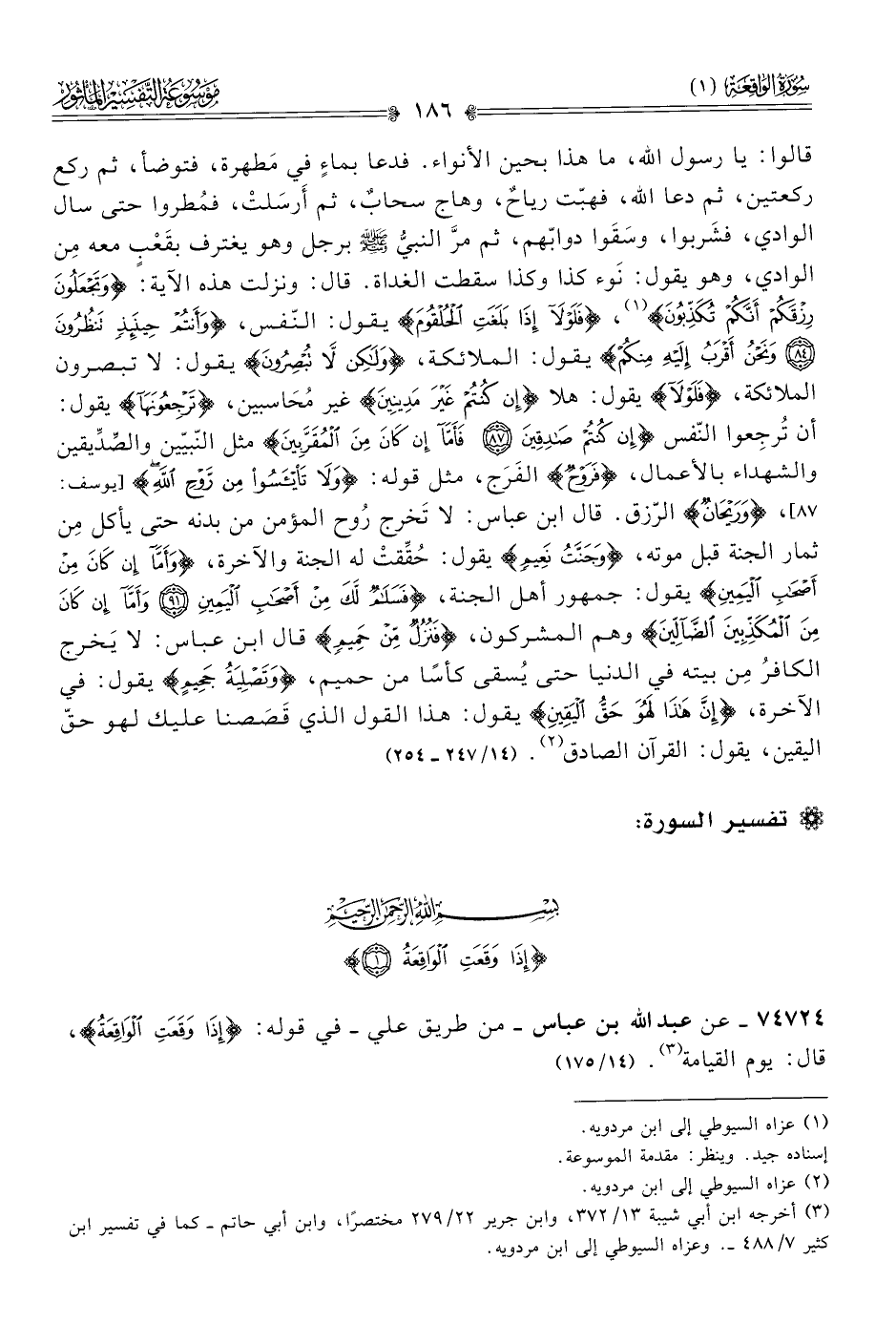 قالوا: يا رسول الله، ما هذا بحين الأنواء. فدعا بماءٍ في مَطهرة، فتوضأ، ثم ركع ركعتين، ثم دعا الله، فهبّت رياحٌ، وهاج سحابٌ، ثم أرسَلتْ، فمُطروا حتى سال الوادي، فشَربوا، وسَقَوا دوابّهم، ثم مرَّ النبيُّ - صلى الله عليه وسلم - برجل وهو يغترف بقَعْبٍ معه مِن الوادي، وهو يقول: نَوء كذا وكذا سقطت الغداة. قال: ونزلت هذه الآية: {وتَجْعَلُونَ رِزْقَكُمْ أنَّكُمْ تُكَذِّبُونَ} (¬١)، {فَلَوْلا إذا بَلَغَتِ الحُلْقُومَ} يقول: النّفس، {وأَنْتُمْ حِينَئِذٍ تَنْظُرُونَ ونَحْنُ أقْرَبُ إلَيْهِ مِنكُمْ} يقول: الملائكة، {ولَكِنْ لا تُبْصِرُونَ} يقول: لا تبصرون الملائكة، {فَلَوْلا} يقول: هلا {إنْ كُنْتُمْ غَيْرَ مَدِينِينَ} غير مُحاسبين، {تَرْجِعُونَها} يقول: أن تُرجِعوا النّفس {إنْ كُنْتُمْ صادِقِينَ فَأَمّا إنْ كانَ مِنَ المُقَرَّبِينَ} مثل النّبيّين والصِّدِّيقين والشهداء بالأعمال، {فَرَوْحٌ} الفَرَج، مثل قوله: {ولا تَيْأَسُوا مِن رَوْحِ اللَّهِ} [يوسف: ٨٧]، {ورَيْحانٌ} الرّزق. قال ابن عباس: لا تَخرج رُوح المؤمن من بدنه حتى يأكل مِن ثمار الجنة قبل موته، {وجَنَّتُ نَعِيمٍ} يقول: حُقِّقتْ له الجنة والآخرة، {وإمّا إنْ كانَ مِن أصْحابِ اليَمِينِ} يقول: جمهور أهل الجنة، {فَسَلامٌ لَكَ مِن أصْحابِ اليَمِينِ وأَمّا إنْ كانَ مِنَ المُكَذِّبِينَ الضّالِّينَ} وهم المشركون، {فَنُزُلٌ مِن حَمِيمٍ} قال ابن عباس: لا يَخرج الكافرُ مِن بيته في الدنيا حتى يُسقى كأسًا من حميم، {وتَصْلِيَةُ جَحِيمٍ} يقول: في الآخرة، {إنَّ هَذا لَهُوَ حَقُّ اليَقِينِ} يقول: هذا القول الذي قَصَصنا عليك لهو حقّ اليقين، يقول: القرآن الصادق (¬٢). (١٤/ ٢٤٧ - ٢٥٤)