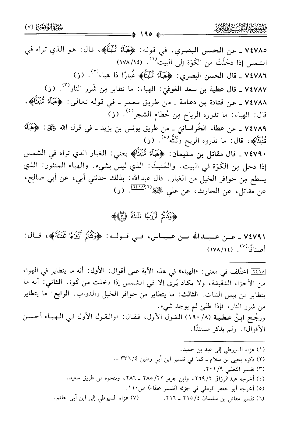 ٧٤٧٨٧ - قال عطية بن سعد العَوفيّ: الهباء: ما تطاير مِن شَرر النار (¬٣). (ز)