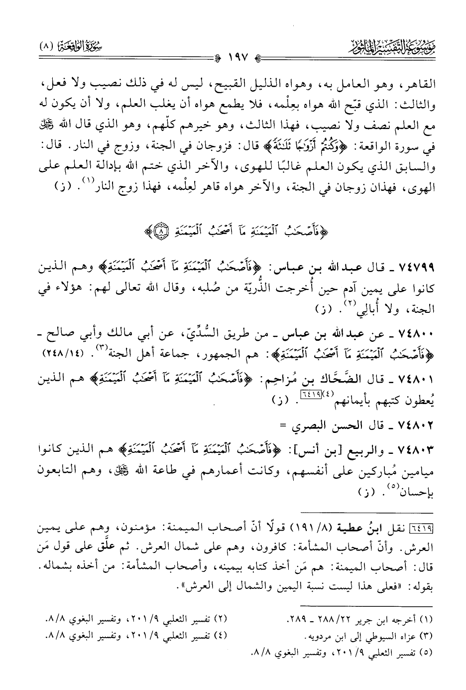 ٧٤٨٠٣ - والربيع [بن أنس]: {فَأَصْحابُ المَيْمَنَةِ ما أصْحابُ المَيْمَنَةِ} هم الذين كانوا ميامين مُباركين على أنفسهم، وكانت أعمارهم في طاعة الله - عز وجل -، وهم التابعون بإحسان (¬٥). (ز)