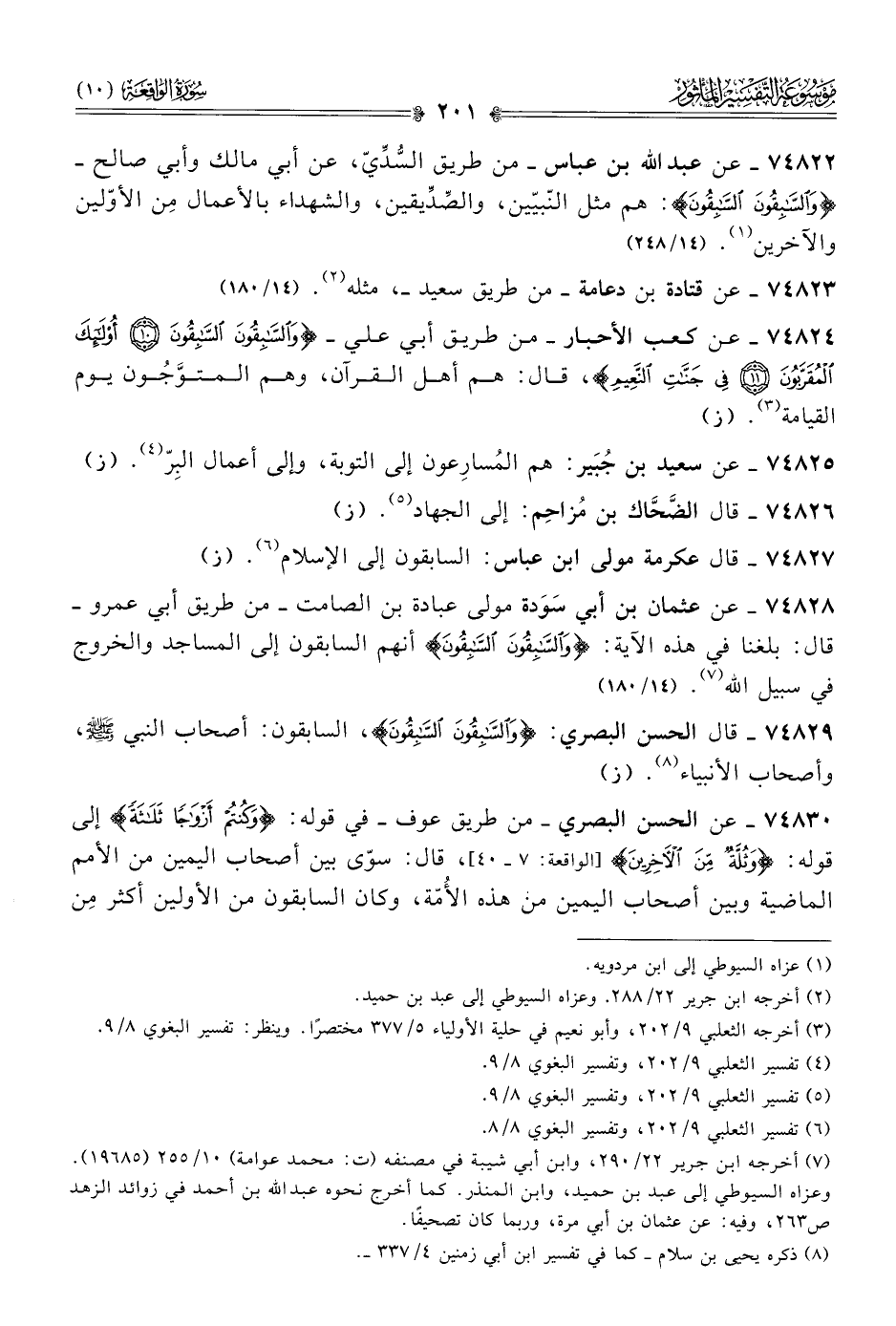 ٧٤٨٢٢ - عن عبد الله بن عباس -من طريق السُّدِّيّ، عن أبي مالك وأبي صالح- {والسّابِقُونَ السّابِقُونَ}: هم مثل النّبيّين، والصِّدِّيقين، والشهداء بالأعمال مِن الأوّلين والآخرين (¬١). (١٤/ ٢٤٨)