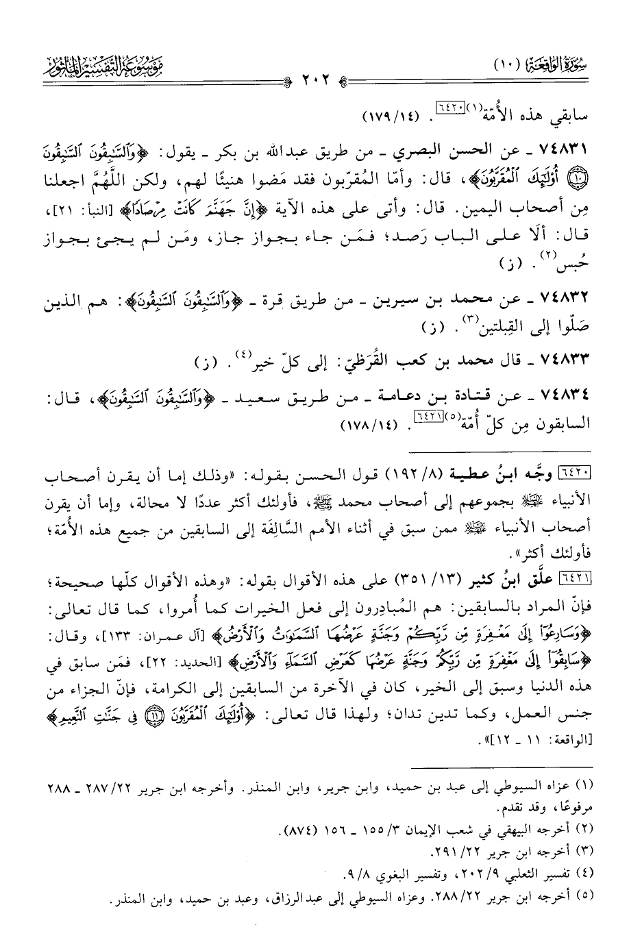 [٦٤٢١] علَّق ابنُ كثير (١٣/ ٣٥١) على هذه الأقوال بقوله: «وهذه الأقوال كلّها صحيحة؛ فإنّ المراد بالسابقين: هم المُبادِرون إلى فعل الخيرات كما أُمروا، كما قال تعالى: {وسارِعُوا إلى مَغْفِرَةٍ مِن رَبِّكُمْ وجَنَّةٍ عَرْضُها السَّمَواتُ والأرْضُ} [آل عمران: ١٣٣]، وقال: {سابِقُوا إلى مَغْفِرَةٍ مِن رَبِّكُمْ وجَنَّةٍ عَرْضُها كَعَرْضِ السَّماءِ والأرْضِ} [الحديد: ٢٢]، فمَن سابق في هذه الدنيا وسبق إلى الخير، كان في الآخرة من السابقين إلى الكرامة، فإنّ الجزاء من جنس العمل، وكما تدين تدان؛ ولهذا قال تعالى: {أُولَئِكَ المُقَرَّبُونَ فِي جَنّاتِ النَّعِيمِ} [الواقعة: ١١ - ١٢]».