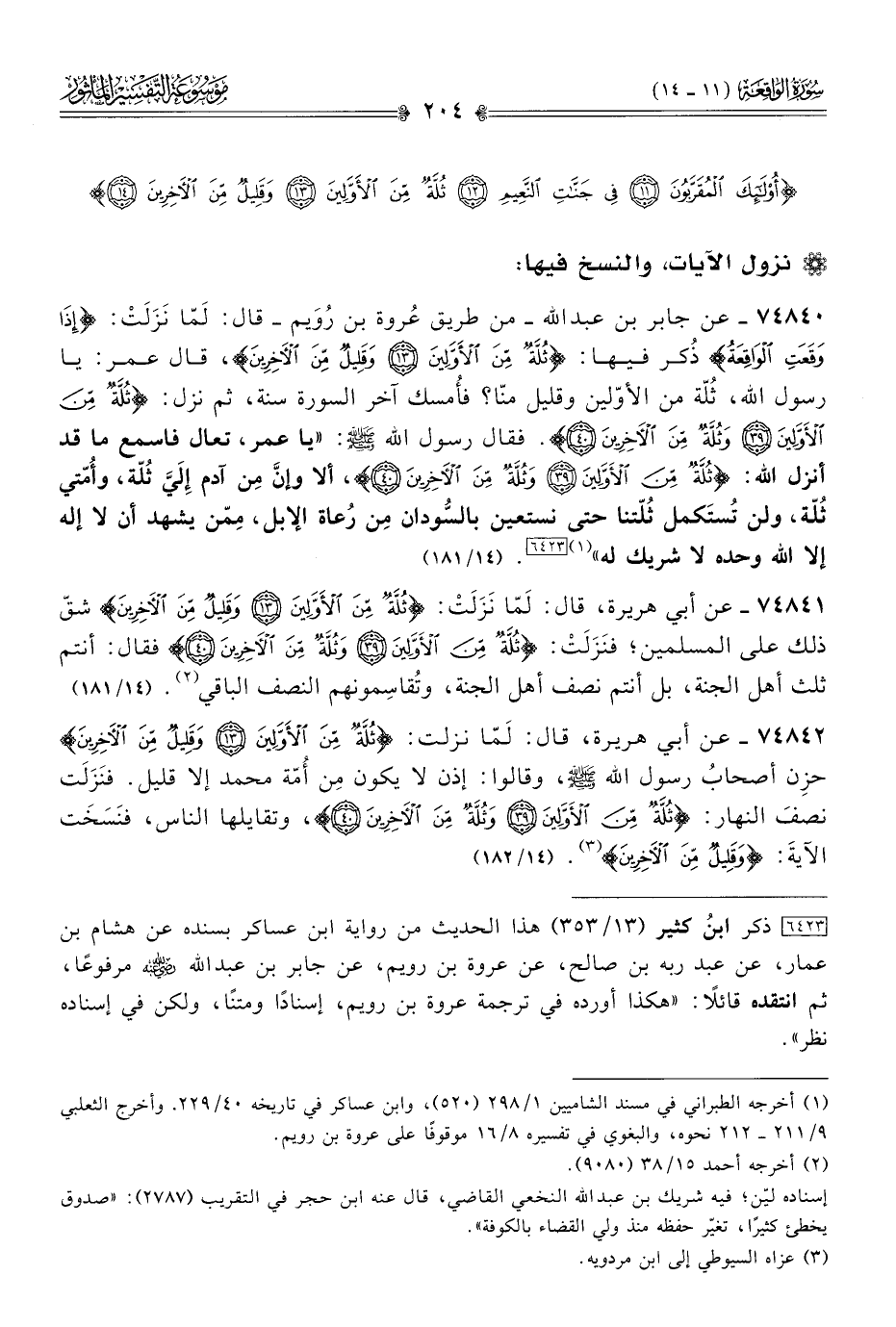 ٧٤٨٤٠ - عن جابر بن عبد الله -من طريق عُروة بن رُوَيم- قال: لَمّا نَزَلَتْ: {إذا وقَعَتِ الواقِعَةُ} ذُكر فيها: {ثُلَّةٌ مِنَ الأَوَّلِينَ وقَلِيلٌ مِنَ الآخِرِينَ}، قال عمر: يا رسول الله، ثُلّة من الأوّلين وقليل منّا؟ فأُمسك آخر السورة سنة، ثم نزل: {ثُلَّةٌ مِنَ الأَوَّلِينَ وثُلَّةٌ مِنَ الآخِرِينَ}. فقال رسول الله - صلى الله عليه وسلم -: «يا عمر، تعال فاسمع ما قد أنزل الله: {ثُلَّةٌ مِنَ الأَوَّلِينَ وثُلَّةٌ مِنَ الآخِرِينَ}، ألا وإنّ مِن آدم إلَيَّ ثُلّة، وأُمّتي ثُلّة، ولن تُستَكمل ثُلّتنا حتى نستعين بالسُّودان مِن رُعاة الإبل، مِمّن يشهد أن لا إله إلا الله وحده لا شريك له» (¬١) [٦٤٢٣] (١٤/ ١٨١)