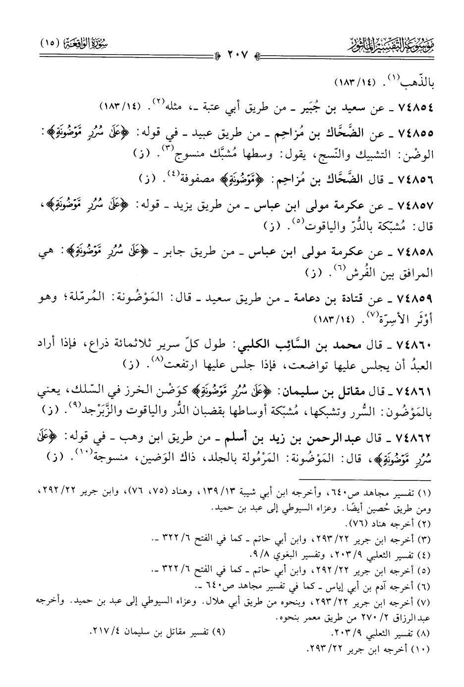 ٧٤٨٥٨ - عن عكرمة مولى ابن عباس -من طريق جابر- {عَلى سُرُرٍ مَوْضُونَةٍ}: هي المرافق بين الفُرش (¬٦). (ز)