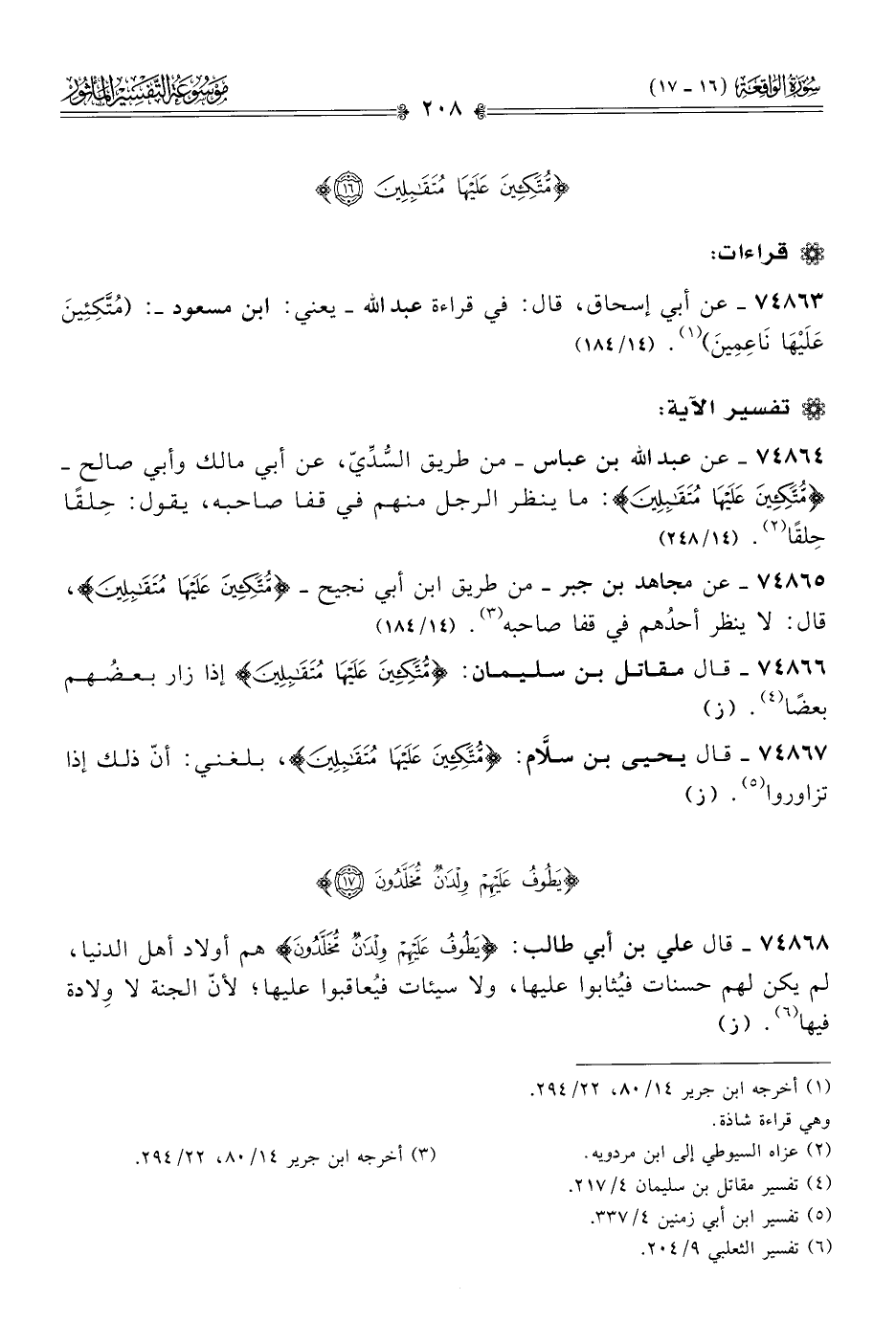 ٧٤٨٦٣ - عن أبي إسحاق، قال: في قراءة عبد الله -يعني: ابن مسعود-: (مُتَّكِئِينَ عَلَيْها ناعِمِينَ) (¬١). (١٤/ ١٨٤)