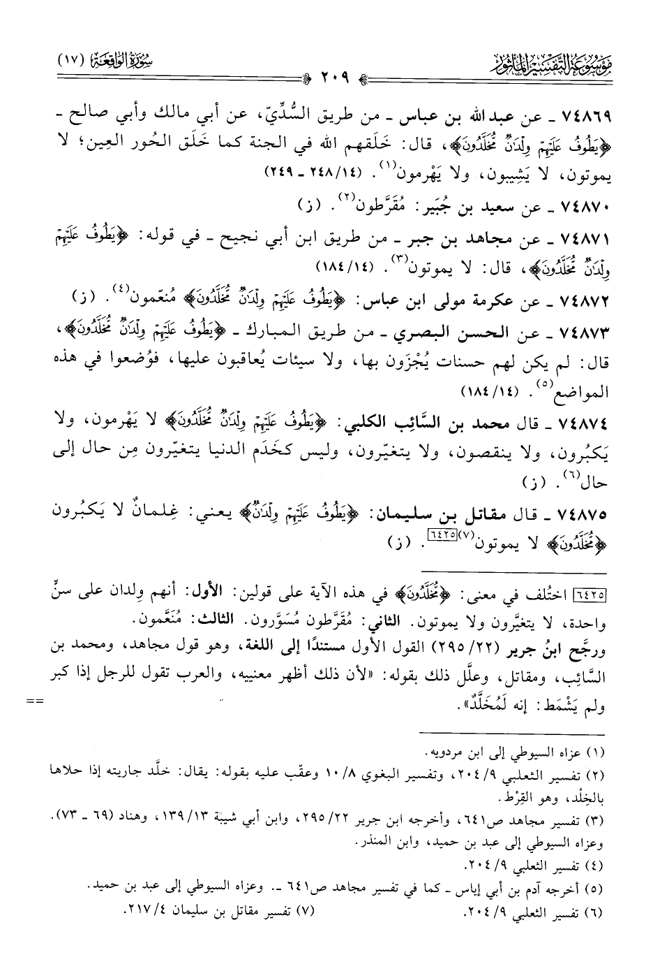 ٧٤٨٧٢ - عن عكرمة مولى ابن عباس: {يَطُوفُ عَلَيْهِمْ وِلْدانٌ مُخَلَّدُونَ} مُنعّمون (¬٤). (ز)