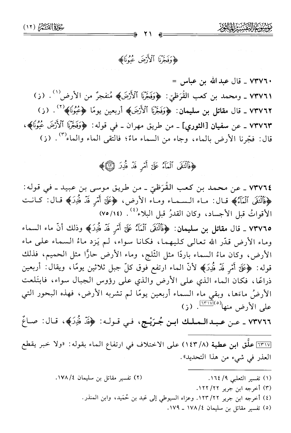 ٧٣٧٦٢ - قال مقاتل بن سليمان: {وفَجَّرْنا الأَرْضَ} أربعين يومًا {عُيُونًا} (¬٢). (ز)