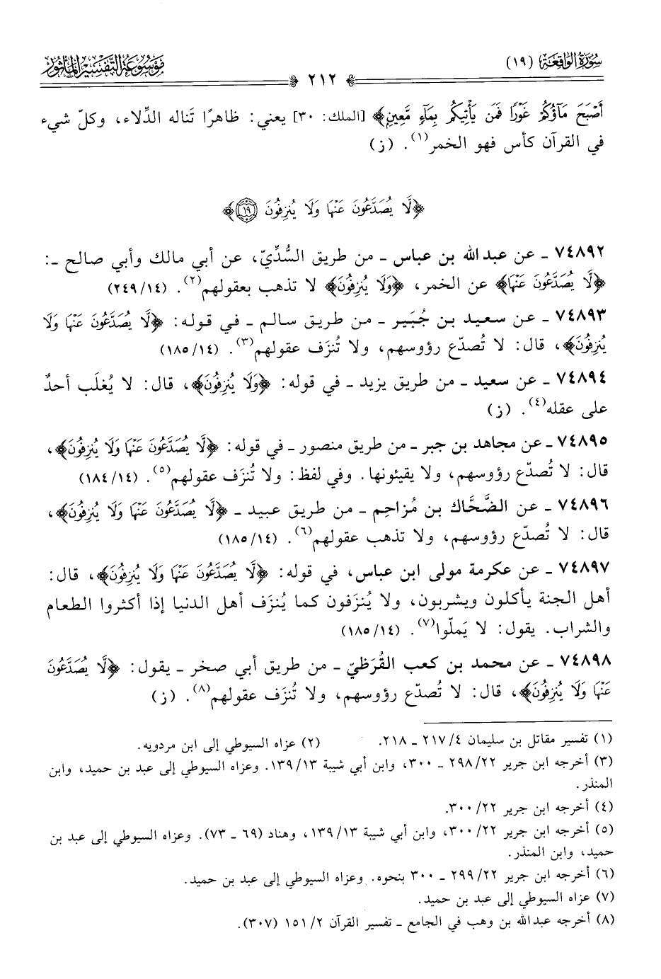 ٧٤٨٩٣ - عن سعيد بن جُبَير -من طريق سالم- في قوله: {لا يُصَدَّعُونَ عَنْها ولا يُنْزِفُونَ}، قال: لا تُصدّع رؤوسهم، ولا تُنزَف عقولهم (¬٣). (١٤/ ١٨٥)