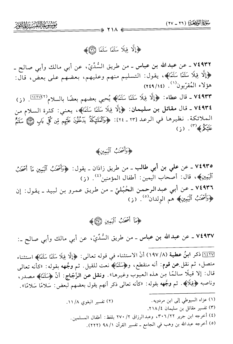 ٧٤٩٣٢ - عن عبد الله بن عباس -من طريق السُّدِّيّ، عن أبي مالك وأبي صالح- {إلّا قِيلًا سَلامًا سَلامًا}، يقول: التسليم منهم وعليهم، بعضهم على بعض، قال: هؤلاء المُقرّبون (¬١). (١٤/ ٢٤٩)