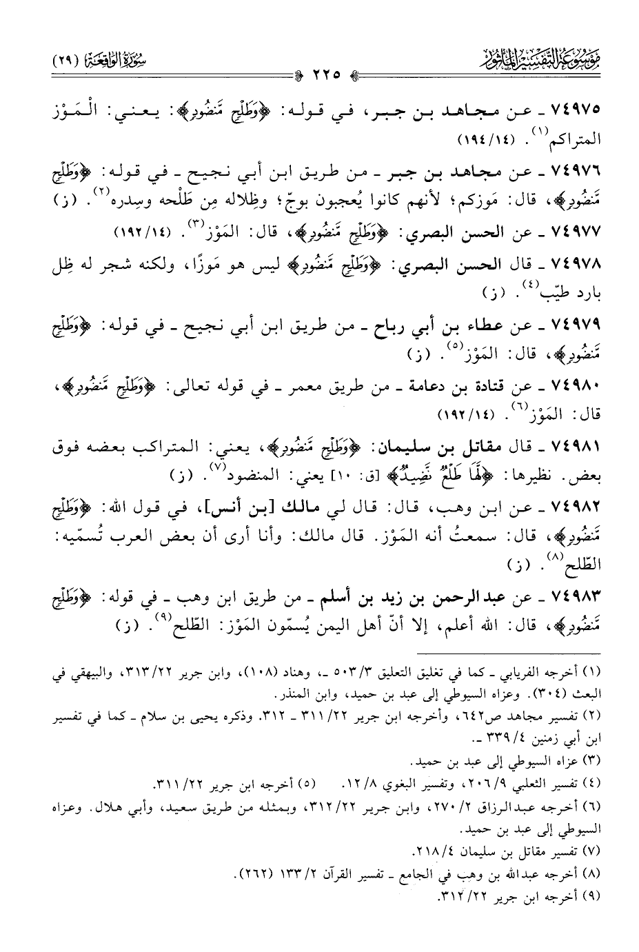 ٧٤٩٧٥ - عن مجاهد بن جبر، في قوله: {وطَلْحٍ مَنضُودٍ}: يعني: المَوْز المتراكم (¬١). (١٤/ ١٩٤)