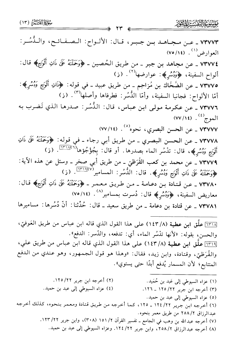 ٧٣٧٧٦ - عن عكرمة مولى ابن عباس، قال: الدُّسُر: صدرها الذي تَضرب به الموج (¬٤). (١٤/ ٧٧)