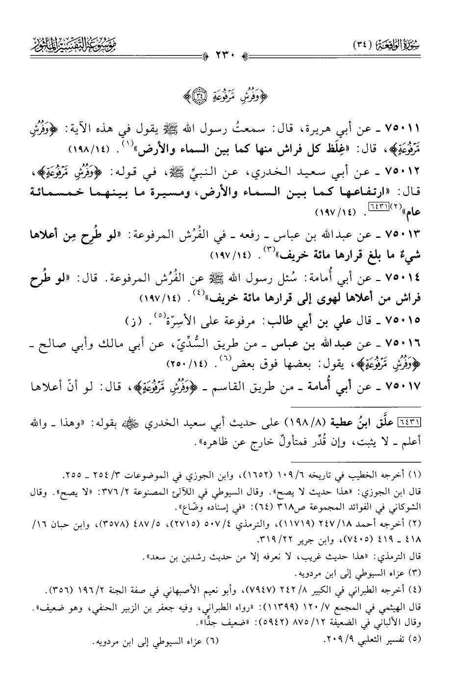 ٧٥٠١١ - عن أبي هريرة، قال: سمعتُ رسول الله - صلى الله عليه وسلم - يقول في هذه الآية: {وفُرُشٍ مَرْفُوعَةٍ}، قال: «غِلَظ كل فراش منها كما بين السماء والأرض» (¬١). (١٤/ ١٩٨)