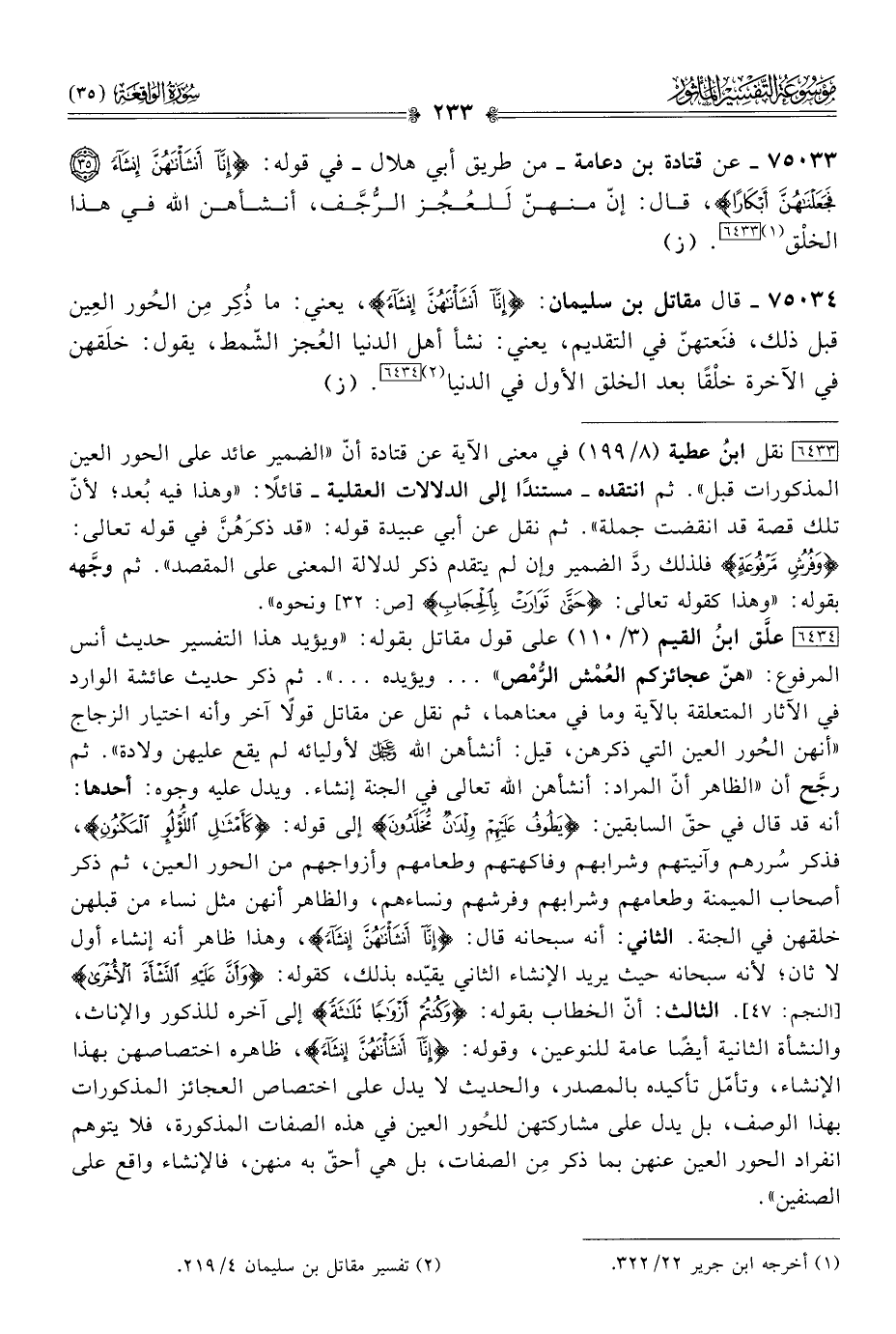 [٦٤٣٤] علَّق ابنُ القيم (٣/ ١١٠) على قول مقاتل بقوله: «ويؤيد هذا التفسير حديث أنس المرفوع: «هنّ عجائزكم العُمْش الرُّمْص» ... ويؤيده ... ». ثم ذكر حديث عائشة الوارد في الآثار المتعلقة بالآية وما في معناهما، ثم نقل عن مقاتل قولًا آخر وأنه اختيار الزجاج «أنهن الحُور العين التي ذكرهن، قيل: أنشأهن الله - عز وجل - لأوليائه لم يقع عليهن ولادة». ثم رجَّح أن «الظاهر أنّ المراد: أنشأهن الله تعالى في الجنة إنشاء. ويدل عليه وجوه: أحدها: أنه قد قال في حقّ السابقين: {يَطُوفُ عَلَيْهِمْ وِلْدانٌ مُخَلَّدُونَ} إلى قوله: {كَأَمْثالِ اللُؤْلُؤِ المَكْنُونِ}، فذكر سُررهم وآنيتهم وشرابهم وفاكهتهم وطعامهم وأزواجهم من الحور العين، ثم ذكر أصحاب الميمنة وطعامهم وشرابهم وفرشهم ونساءهم، والظاهر أنهن مثل نساء من قبلهن خلقهن في الجنة. الثاني: أنه سبحانه قال: {إنّا أنْشَأْناهُنَّ إنْشاءً}، وهذا ظاهر أنه إنشاء أول لا ثان؛ لأنه سبحانه حيث يريد الإنشاء الثاني يقيّده بذلك، كقوله: {وأَنَّ عَلَيْهِ النَّشْأَةَ الأُخْرى} [النجم: ٤٧]. الثالث: أنّ الخطاب بقوله: {وكُنْتُمْ أزْواجًا ثَلاثَةً} إلى آخره للذكور والإناث، والنشأة الثانية أيضًا عامة للنوعين، وقوله: {إنّا أنْشَأْناهُنَّ إنْشاءً}، ظاهره اختصاصهن بهذا الإنشاء، وتأمّل تأكيده بالمصدر، والحديث لا يدل على اختصاص العجائز المذكورات بهذا الوصف، بل يدل على مشاركتهن للحُور العين في هذه الصفات المذكورة، فلا يتوهم انفراد الحور العين عنهن بما ذكر مِن الصفات، بل هي أحقّ به منهن، فالإنشاء واقع على الصنفين».