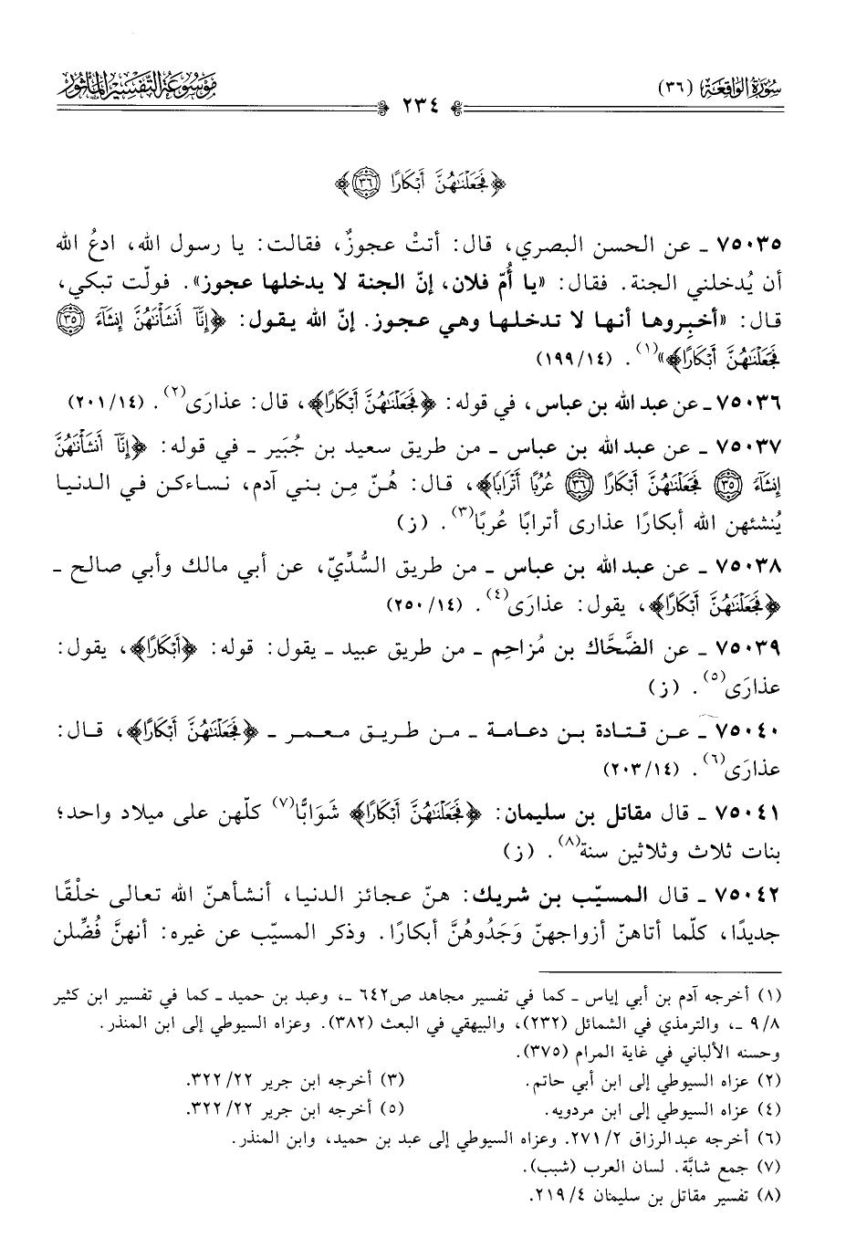 ٧٥٠٤٢ - قال المسيّب بن شريك: هنّ عجائز الدنيا، أنشأهنّ الله تعالى خلْقًا جديدًا، كلّما أتاهنّ أزواجهنّ وجَدُوهُنَّ أبكارًا. وذكر المسيّب عن غيره: أنهنَّ فُضِّلن