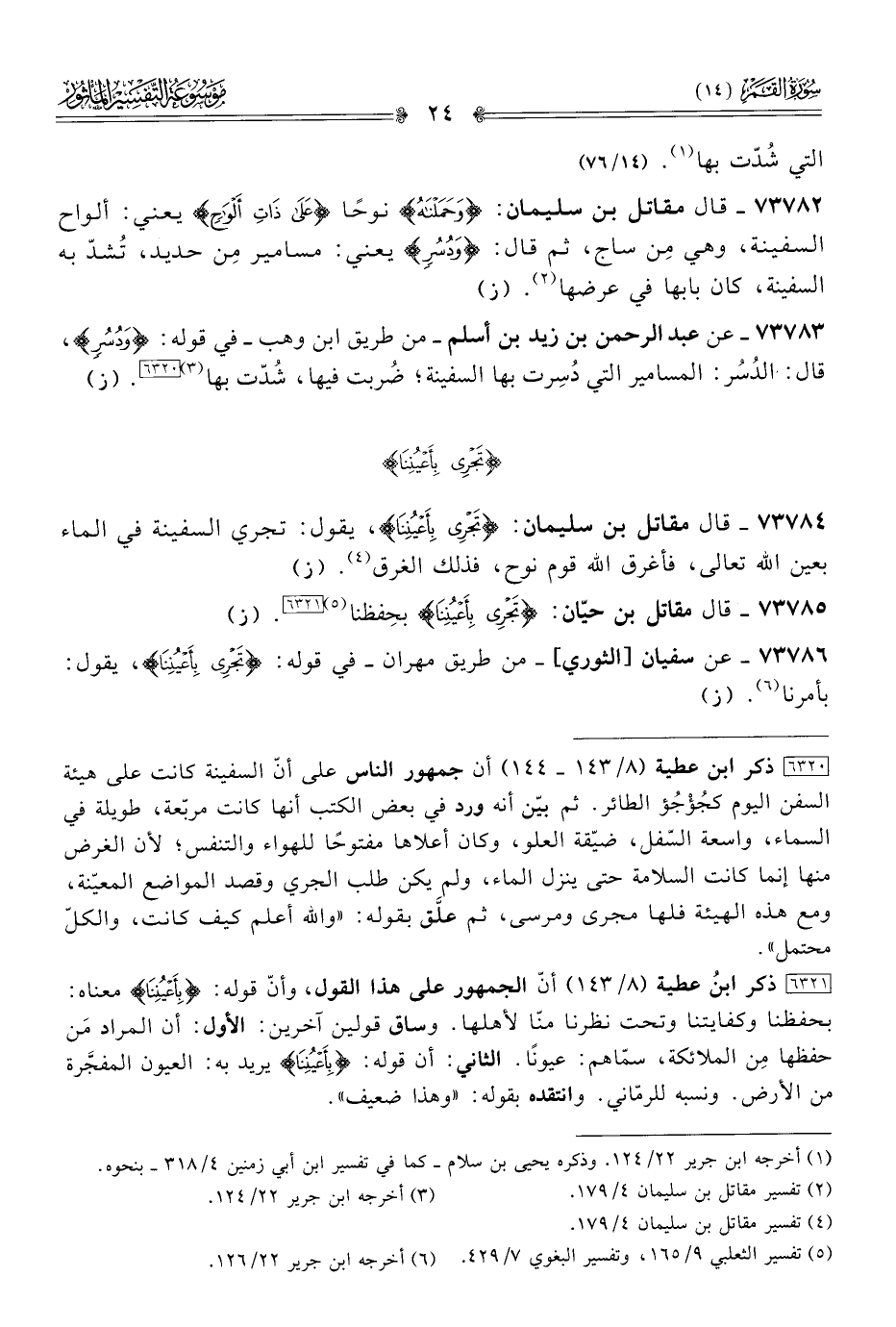 ٧٣٧٨٦ - عن سفيان [الثوري]-من طريق مهران- في قوله: {تَجْرِي بِأَعْيُنِنا}، يقول: بأمرنا (¬٦). (ز)