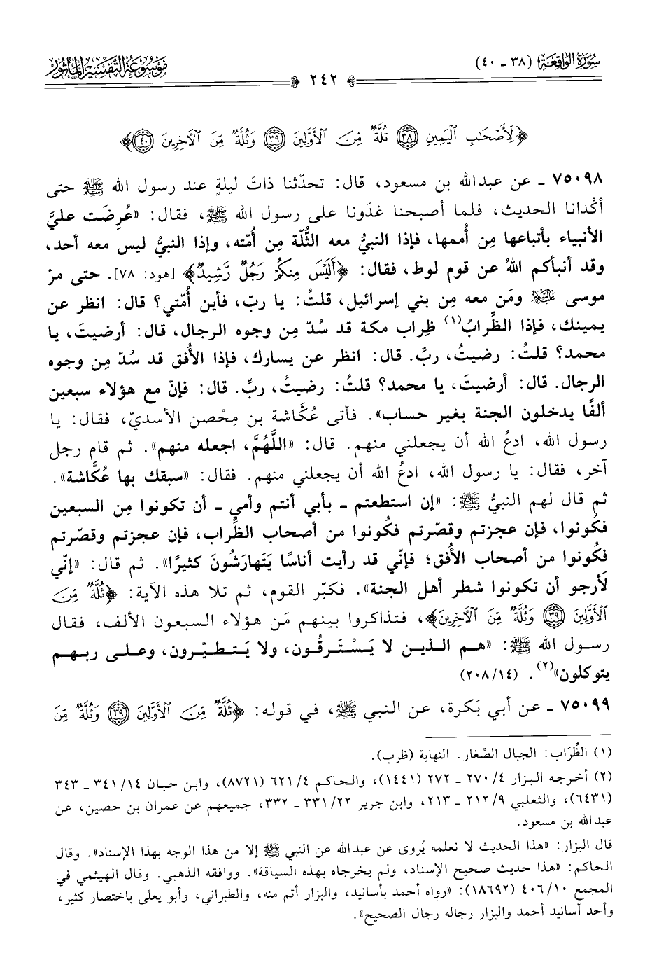 (¬٢) أخرجه البزار ٤/ ٢٧٠ - ٢٧٢ (١٤٤١)، والحاكم ٤/ ٦٢١ (٨٧٢١)، وابن حبان ١٤/ ٣٤١ - ٣٤٣ (٦٤٣١)، والثعلبي ٩/ ٢١٢ - ٢١٣، وابن جرير ٢٢/ ٣٣١ - ٣٣٢، جميعهم عن عمران بن حصين، عن عبد الله بن مسعود.