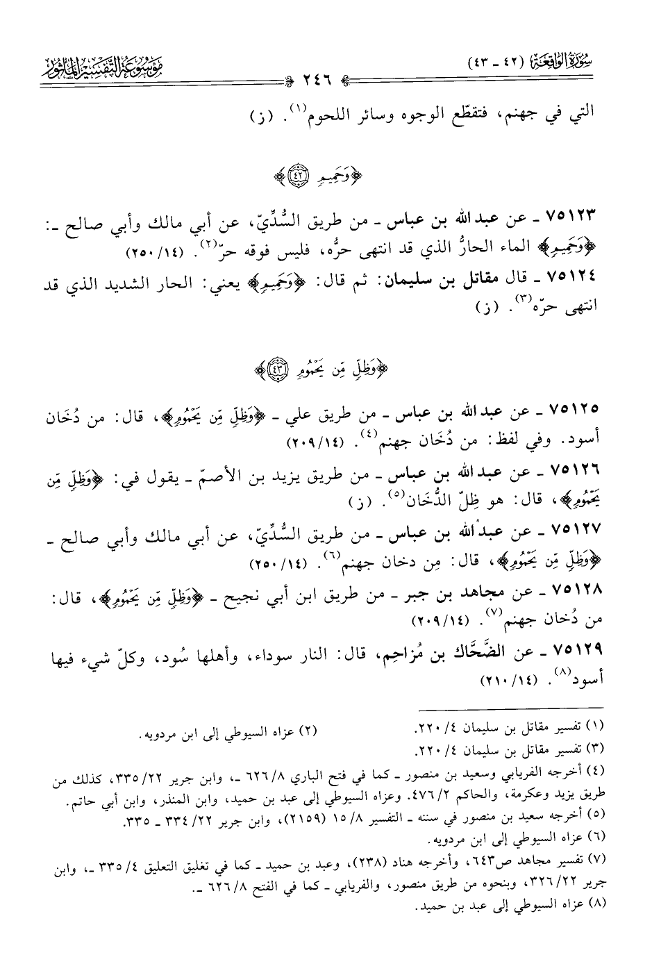 ٧٥١٢٥ - عن عبد الله بن عباس -من طريق علي- {وظِلٍّ مِن يَحْمُومٍ}، قال: من دُخان أسود. وفي لفظ: من دُخان جهنم (¬٤). (١٤/ ٢٥٠)