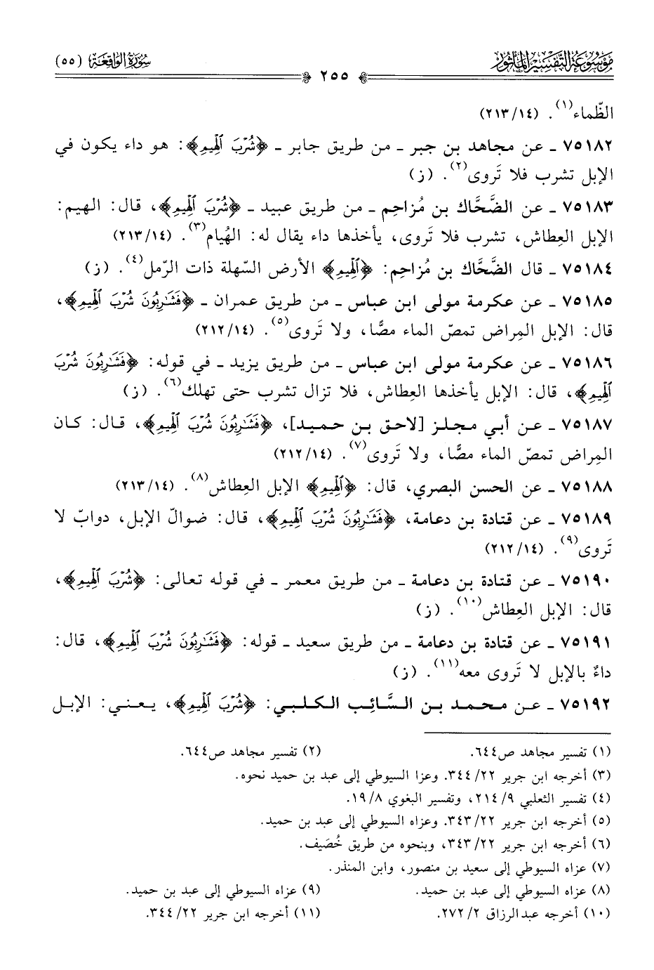 ٧٥١٨٩ - عن قتادة بن دعامة، {فَشارِبُونَ شُرْبَ الهِيمِ}، قال: ضوالّ الإبل، دوابّ لا تَروى (¬٩). (١٤/ ٢١٢)