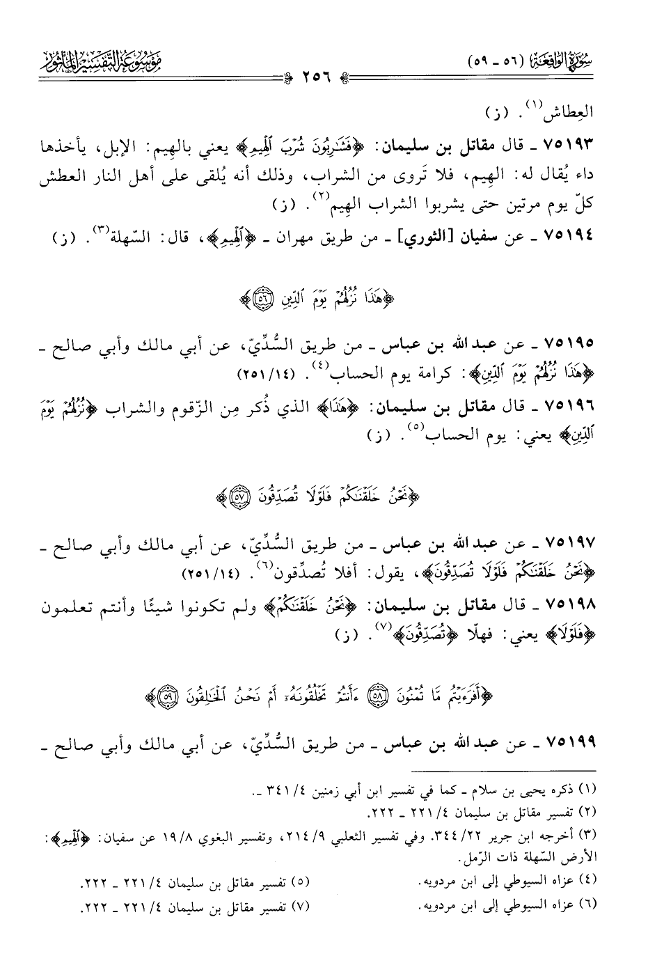 ٧٥١٩٦ - قال مقاتل بن سليمان: {هَذا} الذي ذُكر مِن الزّقوم والشراب {نُزُلُهُمْ يَوْمَ الدِّينِ} يعني: يوم الحساب (¬٥). (ز)