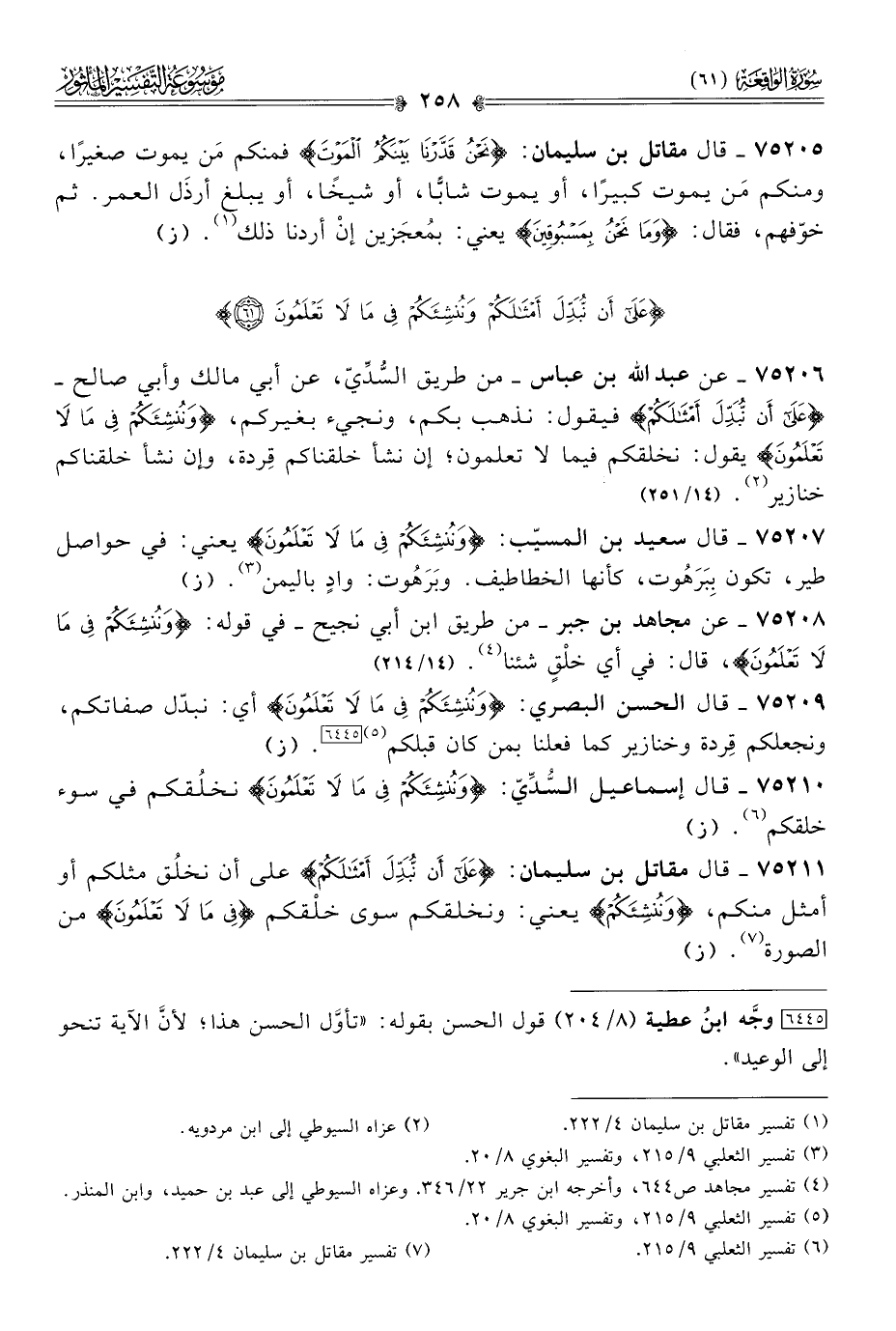٧٥٢٠٩ - قال الحسن البصري: {ونُنْشِئَكُمْ فِي ما لا تَعْلَمُونَ} أي: نبدّل صفاتكم، ونجعلكم قِردة وخنازير كما فعلنا بمن كان قبلكم (¬٥) [٦٤٤٥]. (ز)