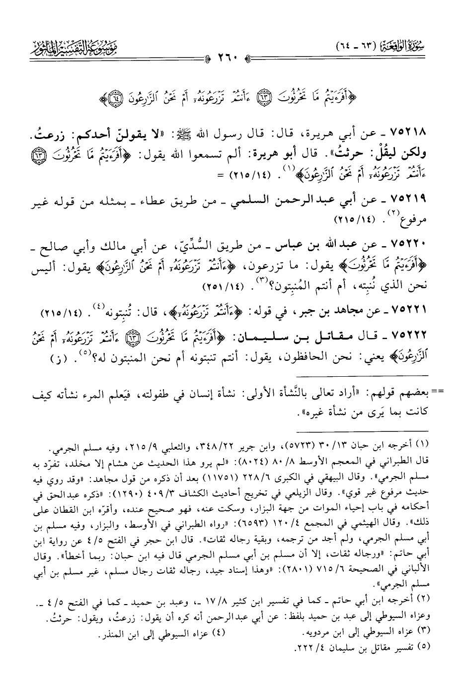٧٥٢١٨ - عن أبي هريرة، قال: قال رسول الله - صلى الله عليه وسلم -: «لا يقولنّ أحدكم: زرعتُ. ولكن ليقُلْ: حرثتُ». قال أبو هريرة: ألم تسمعوا الله يقول: {أفَرَأَيْتُمْ ما تَحْرُثُونَ أأَنْتُمْ تَزْرَعُونَهُ أمْ نَحْنُ الزّارِعُونَ} (¬١). (١٤/ ٢١٥) =