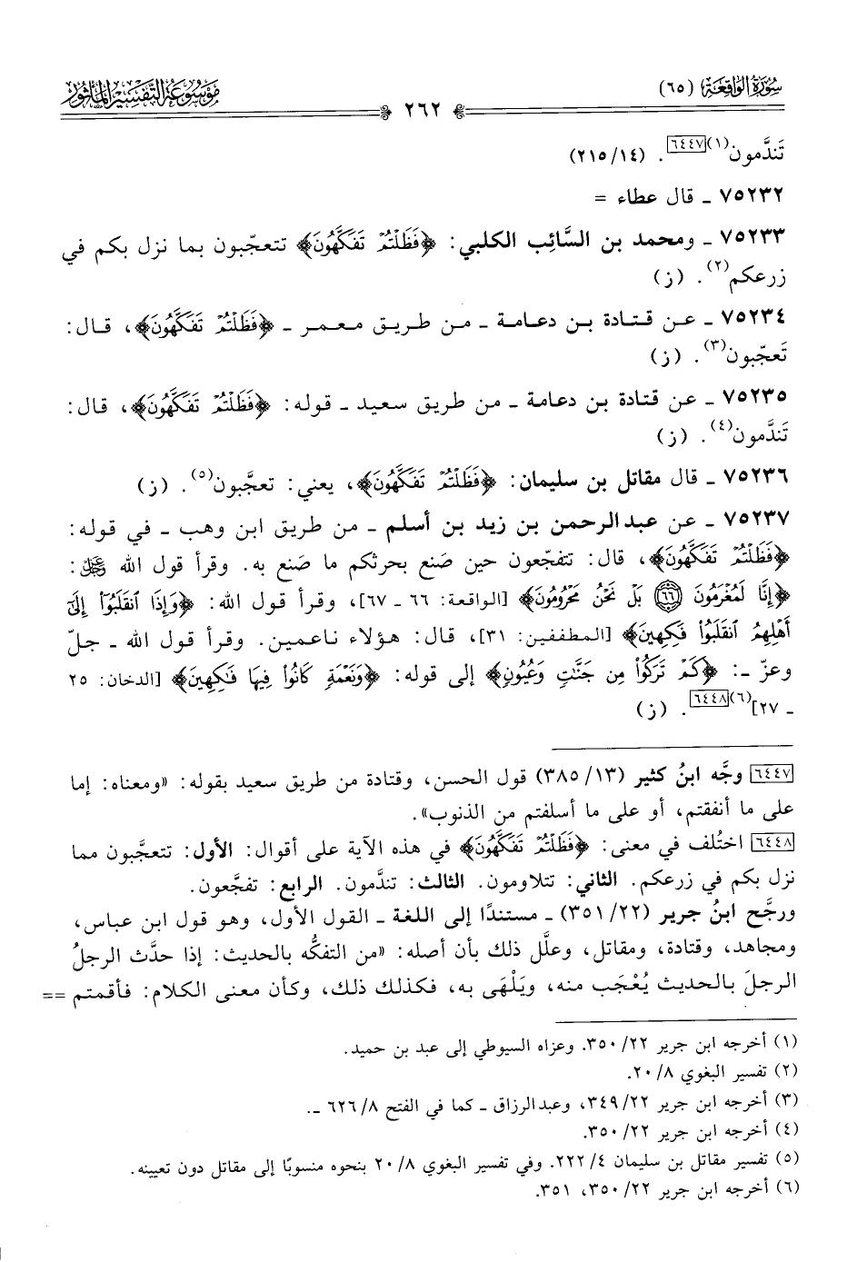 ٧٥٢٣٤ - عن قتادة بن دعامة -من طريق معمر- {فَظَلْتُمْ تَفَكَّهُونَ}، قال: تَعجّبون (¬٣). (ز)