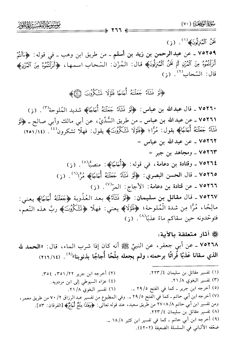 ٧٥٢٦٠ - قال عبد الله بن عباس: {لَوْ نَشاءُ جَعَلْناهُ أُجاجًا} شديد المُلوحة (¬٣). (ز)