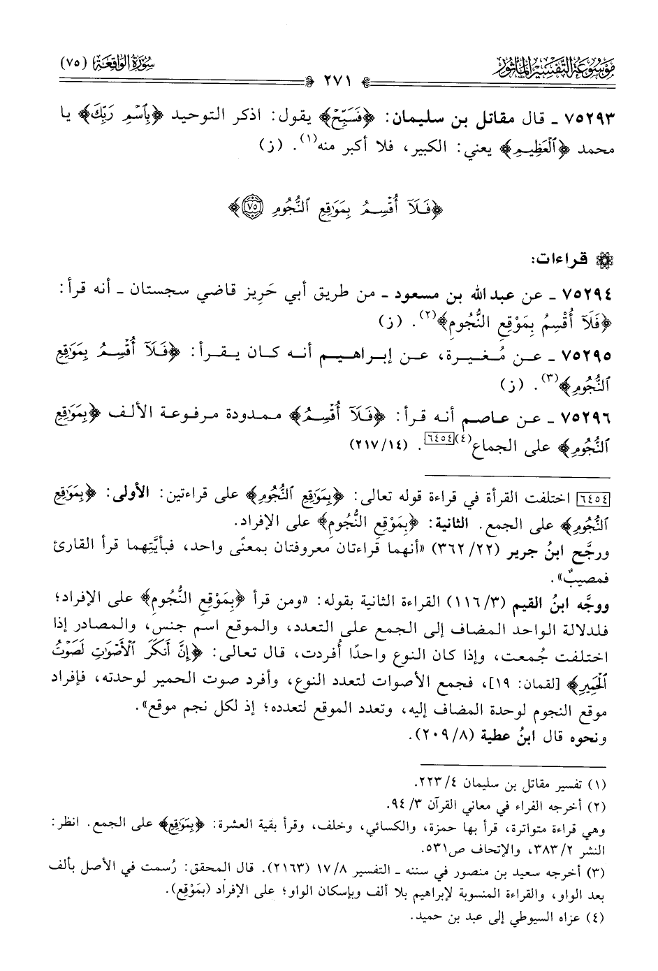 ٧٥٢٩٤ - عن عبد الله بن مسعود -من طريق أبي حَرِيز قاضي سجستان- أنه قرأ: «فَلَآ أُقْسِمُ بِمَوْقِعِ النُّجُومِ» (¬٢). (ز)