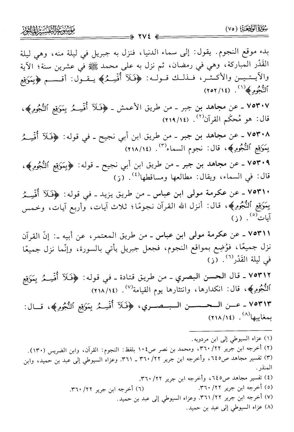 ٧٥٣٠٨ - عن مجاهد بن جبر -من طريق ابن أبي نجيح- في قوله: {فَلا أُقْسِمُ بِمَواقِعِ النُّجُومِ}، قال: نجوم السماء (¬٣).