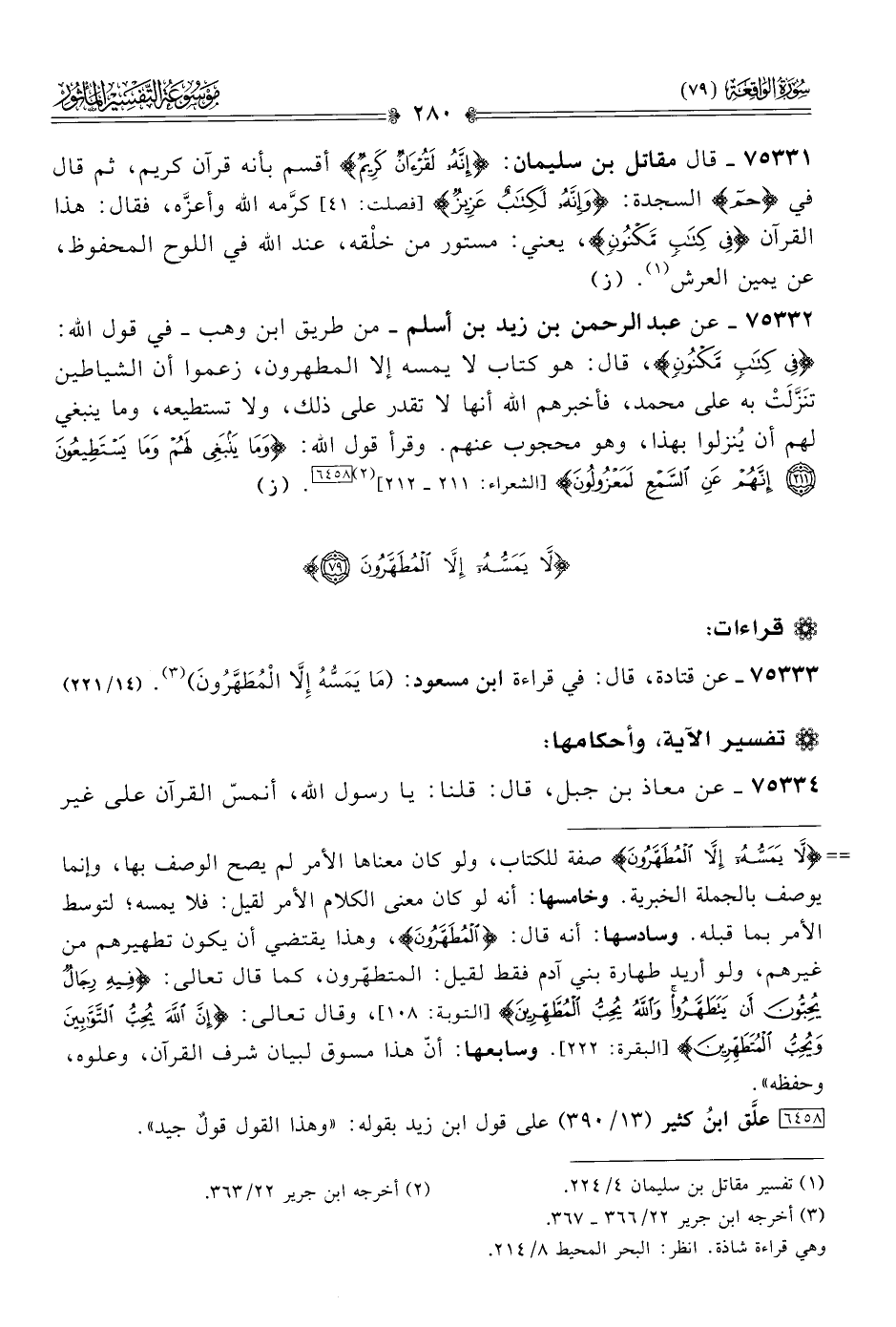 ٧٥٣٣٣ - عن قتادة، قال: في قراءة ابن مسعود: (ما يَمَسُّهُ إلّا المُطَهَّرُونَ) (¬٣). (١٤/ ٢٢١)