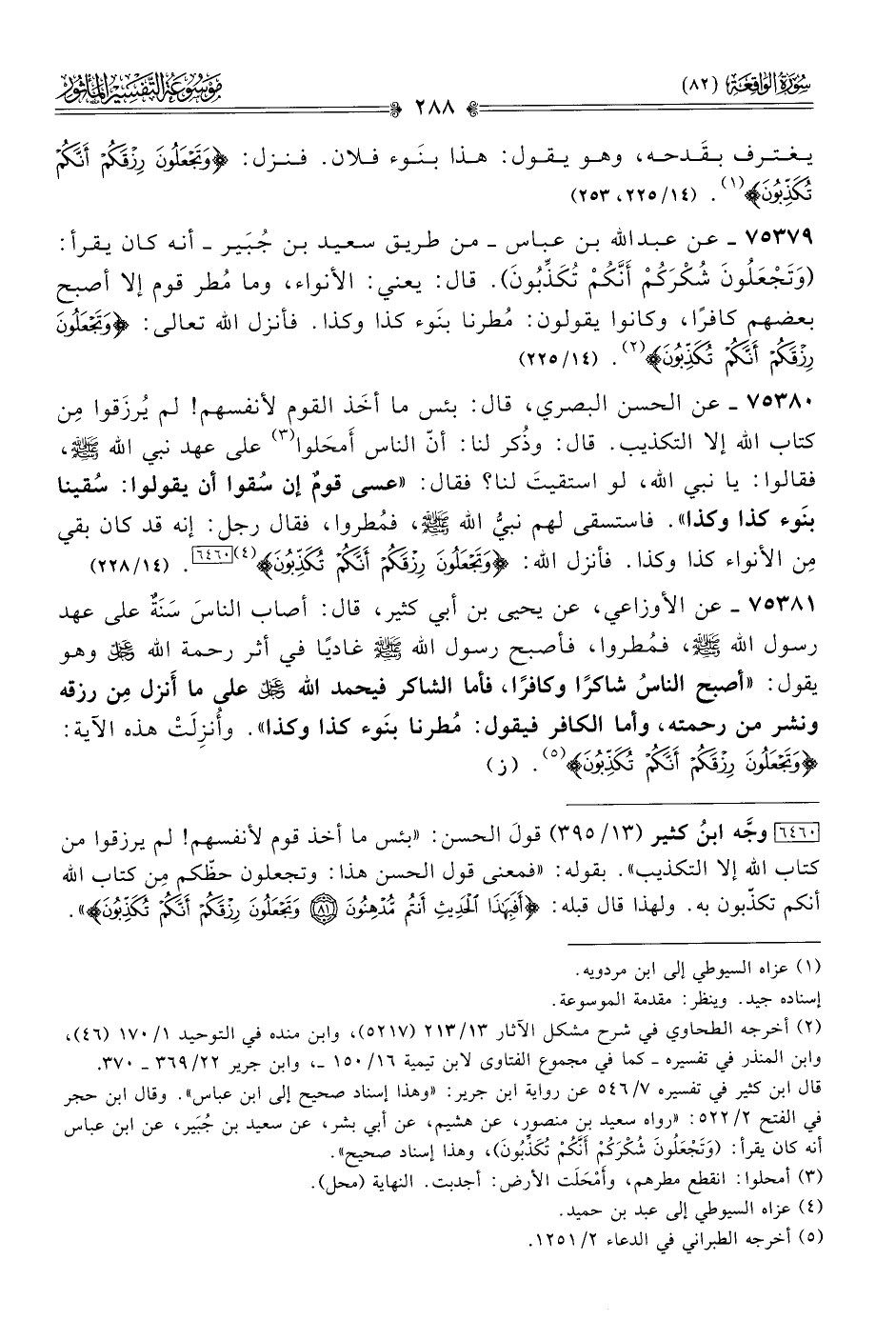 ٧٥٣٧٩ - عن عبد الله بن عباس -من طريق سعيد بن جُبَير- أنه كان يقرأ: (وتَجْعَلُونَ شُكْرَكُمْ أنَّكُمْ تُكَذِّبُونَ). قال: يعني: الأنواء، وما مُطر قوم إلا أصبح بعضهم كافرًا، وكانوا يقولون: مُطرنا بنَوء كذا وكذا. فأنزل الله تعالى: {وتَجْعَلُونَ رِزْقَكُمْ أنَّكُمْ تُكَذِّبُونَ} (¬٢). (١٤/ ٢٢٥)